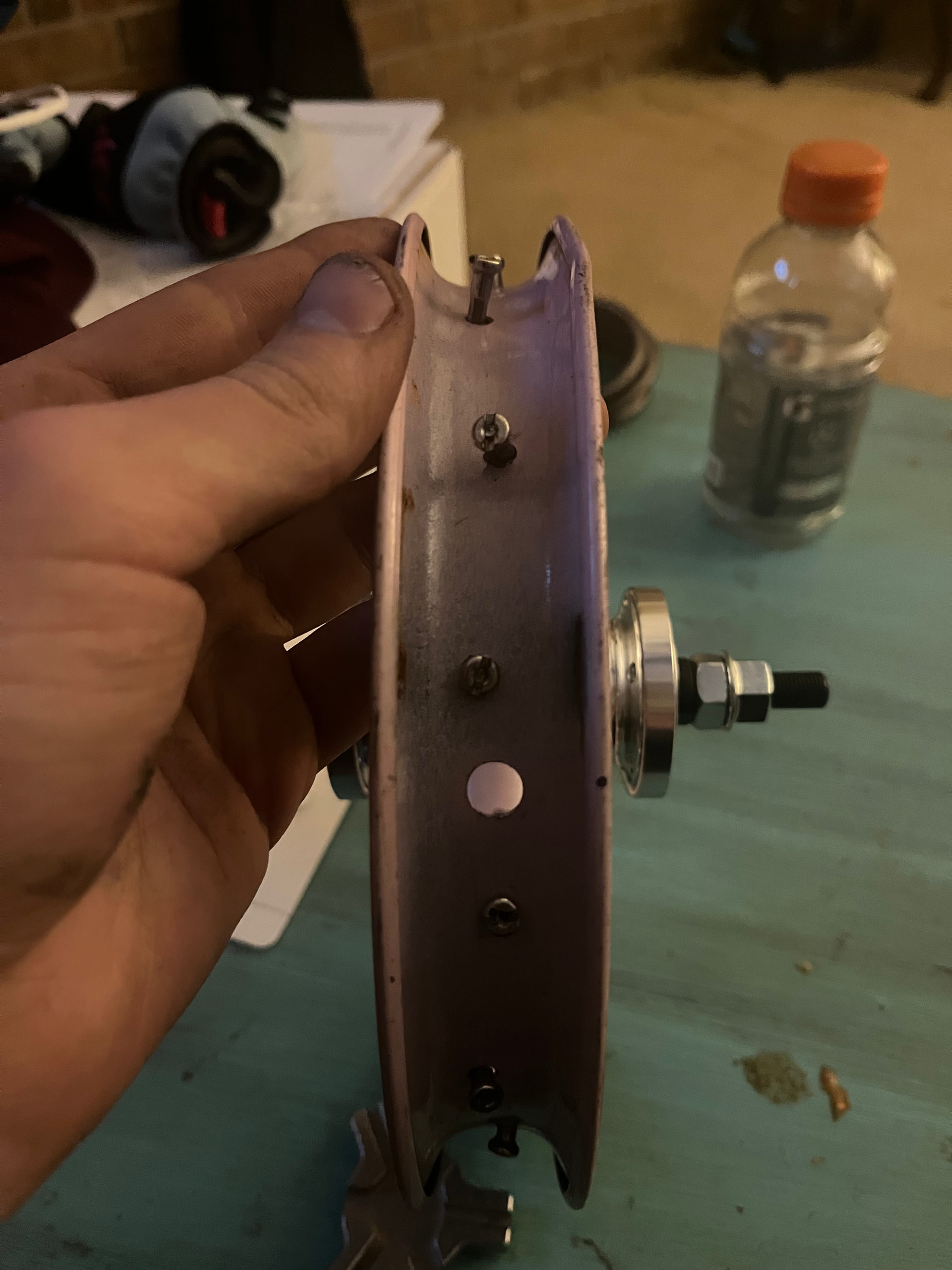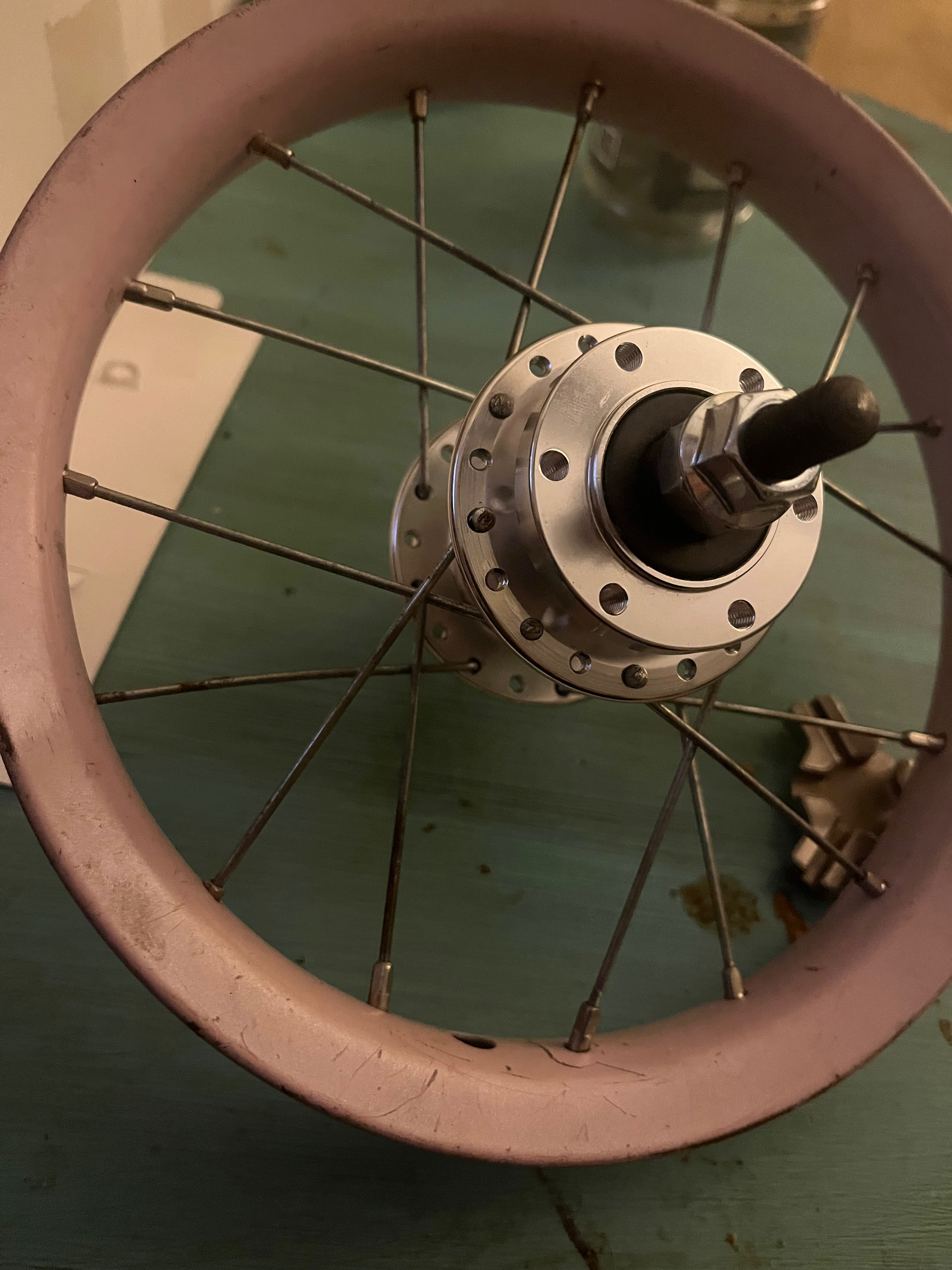 My 15 tooth cog arrived today, I’m going to drill out holes for a 6bolt brake and I laced up my 12” wheel to my new giraffe hub but some of the spokes are long and due to a 16 hole rim and 36 hole hub I had to make a weird pattern so I don’t know how to measure the length