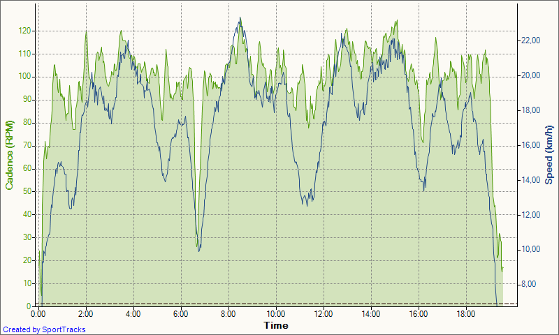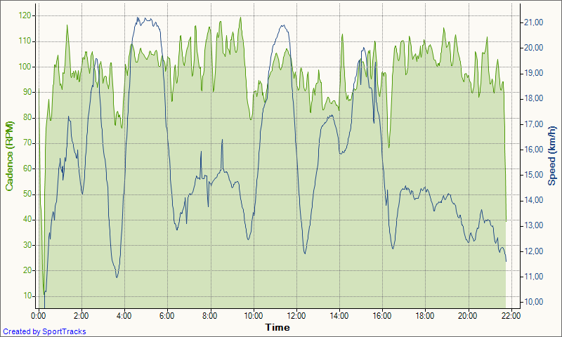 Ich kam etwas ins Grübeln, ob man denn wirklich aus der Geschwindigkeit auf die Trittfrequenz schließen kann, sprich, ob man tatsächlich immer bei derselben Geschwindigkeit schaltet. Und ob die Geschwindigkeit bei der man hochschaltet dieselbe ist wie die, bei der man runterschaltet. Da würden mich ein paar Meinungen interessieren.