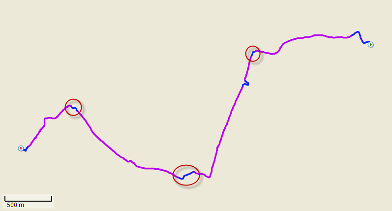 Zumindest habe ich mir mal ein paar GPS-Daten angeschaut. Hier mein gestriger Heimweg von der Arbeit und mein heutiger Hinweg zur Arbeit, jeweils mit dem KH29 gefahren. Auf den blau eingefärbten Streckenabschnitten glaubt die Software, daß ich im kleinen Gang gefahren bin, auf den lila eingefärbten bin ich angeblich im großen Gang gefahren. Surprise, surprise, das stimmt ganz exakt bis auf ein paar ganz wenige Stellen wo es bergauf oder bergab ging (rot eingekreist). Interessant ist auch, daß die resultierende Trittfrequenz (zweites Diagram) relativ konstant ist, unabhängig vom Gang.