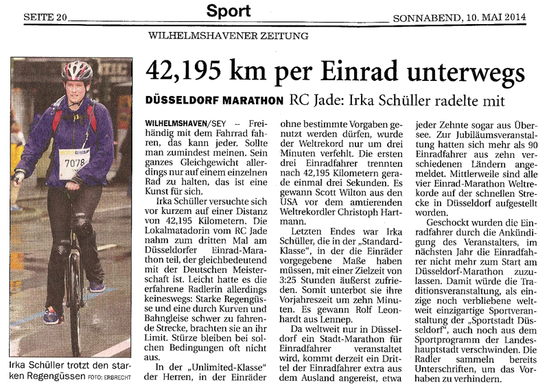 Vor zwei Tagen saß ich gerade auf Arbeit, als mich plötzlich ein Sportreporter der Wilhelmshavener Zeitung angerufen hat. Meine Trainerin aus unserem Verein war so stolz, das zum ersten Mal jemand vom RC Jade am Düsseldorfmarathon teilgenommen hat, dass sie das der Zeitung petzte und das führte dazu, dass ich spontan interviewt wurde und nun ein Zeitungsartikel erschien. Damit der dann aber nicht nur aus Lobeshymnen über meine recht unterdurchschnittliche Leistung besteht, habe ich ihm gleich noch den Pressetext der Düsseldorfer mit auf den Weg gegeben und davon erzählt, dass es wahrscheinlich unser letzter Marathon war. Man kann ja nie genug nerven deswegen.