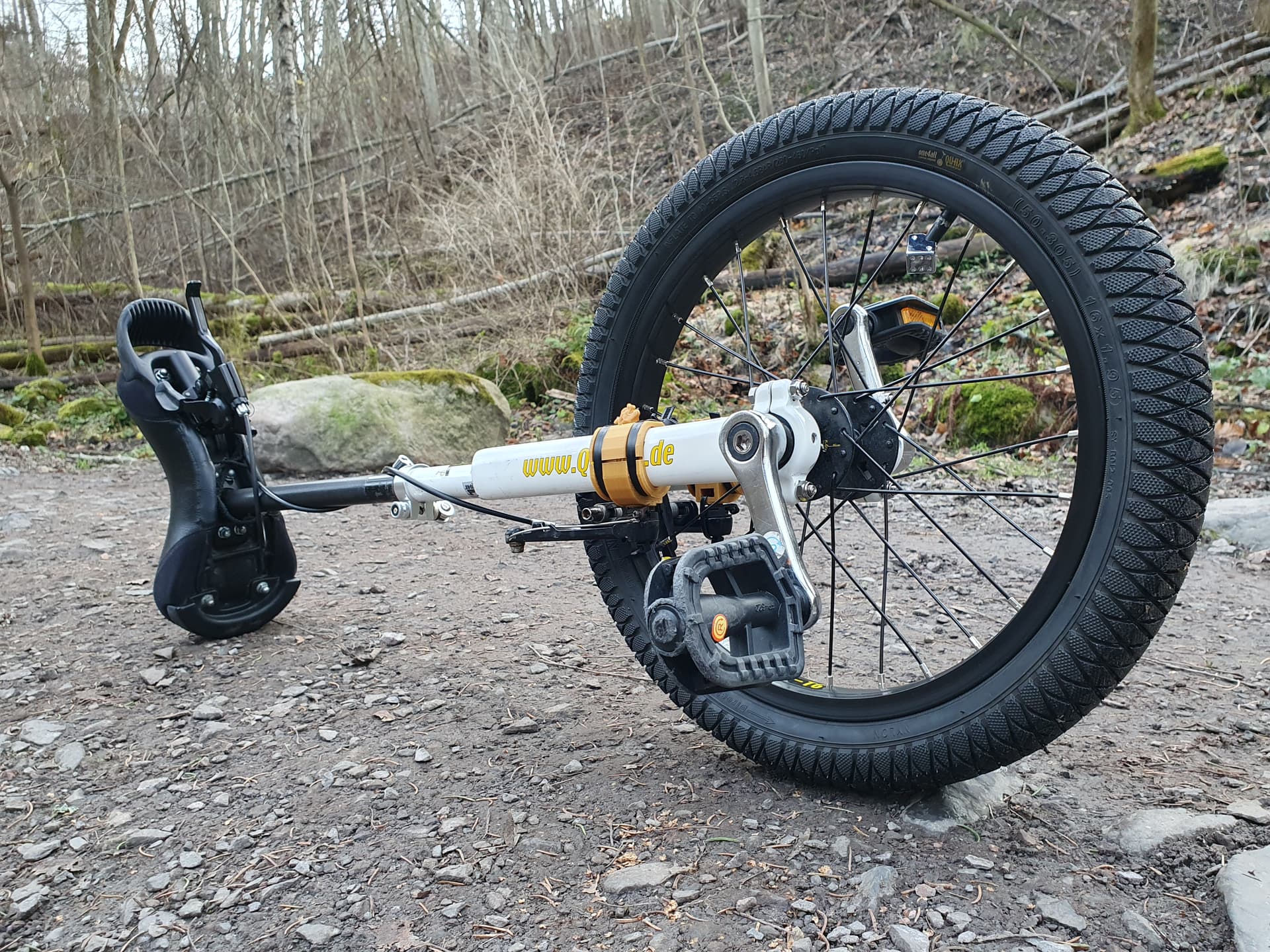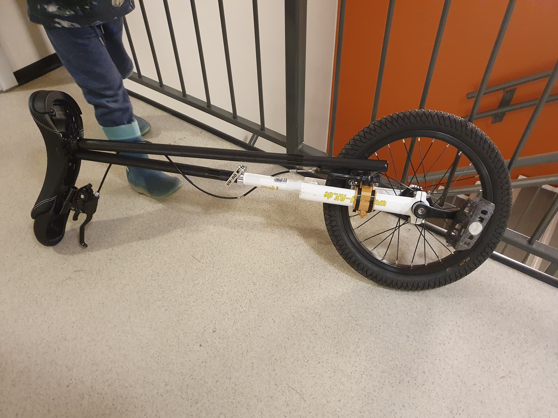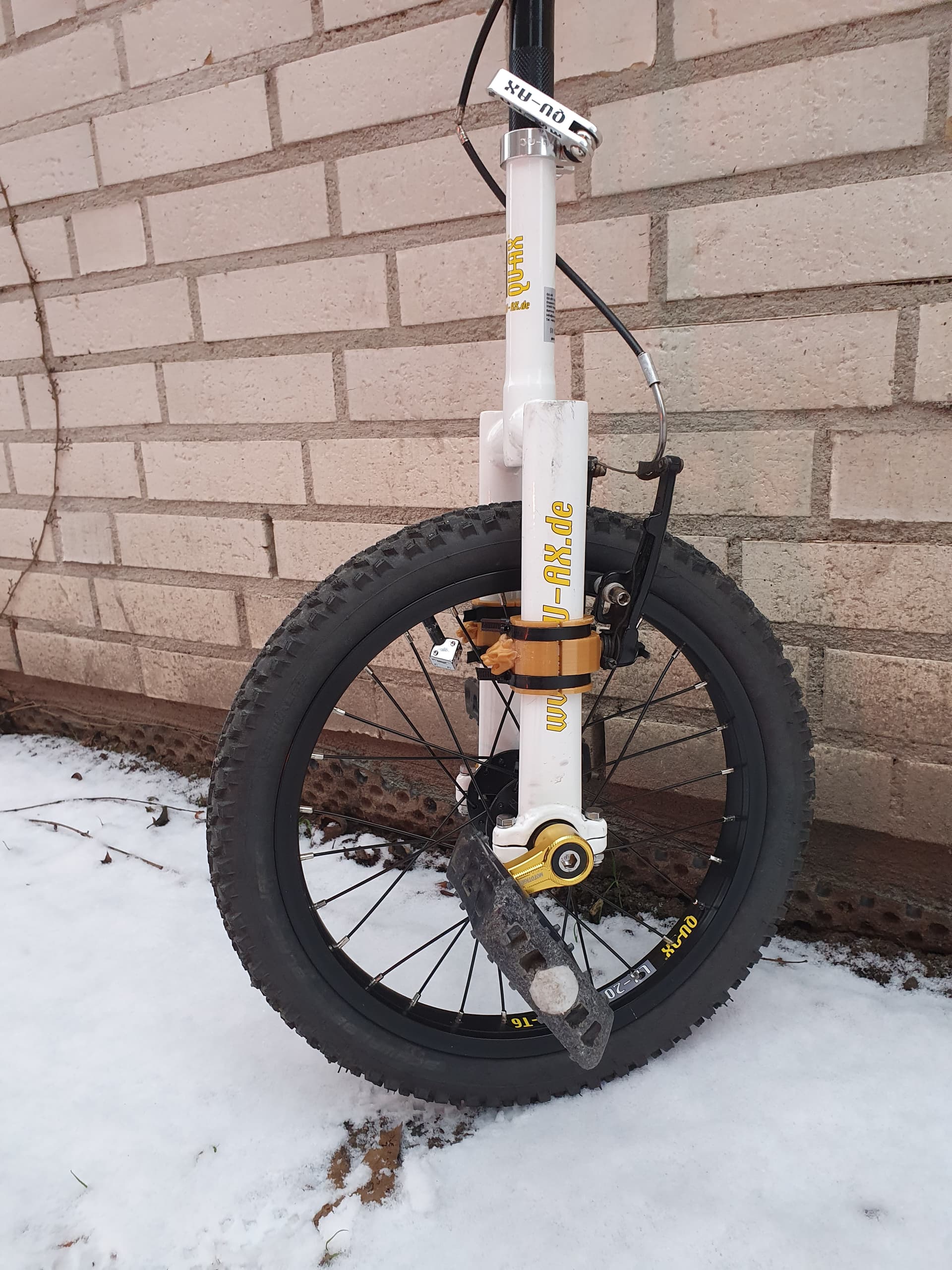 Seatpost: In contrast to the cranks and wheel you want your seatpost to be as long as possible for a longer ride. Especially with 45s, or you might not even be able to mount your Micro Machine at all, not to mention riding up curbs or slopes. I use a 500 mm seatpost for mine. My first attempt was on a 350 mm seatpost: