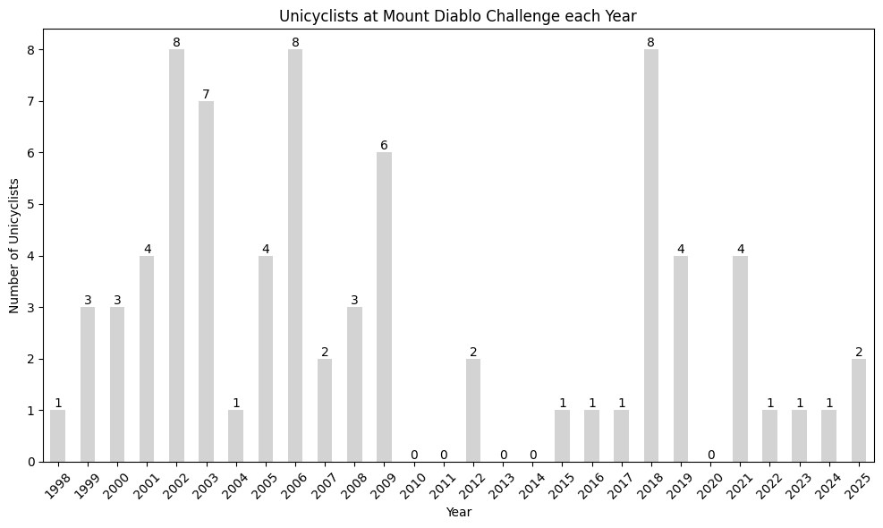 If you have knowledge about these races, please share it below so I can update the table accordingly. Details about 2000, 2010, 2011, 2013, and 2014 would be especially useful, as well as any other information about pre‑2016 unicycle participation. @Nathan mentioned that Gary Kanuch rode a unicycle in at least one of the years, but I am not sure which years these were.