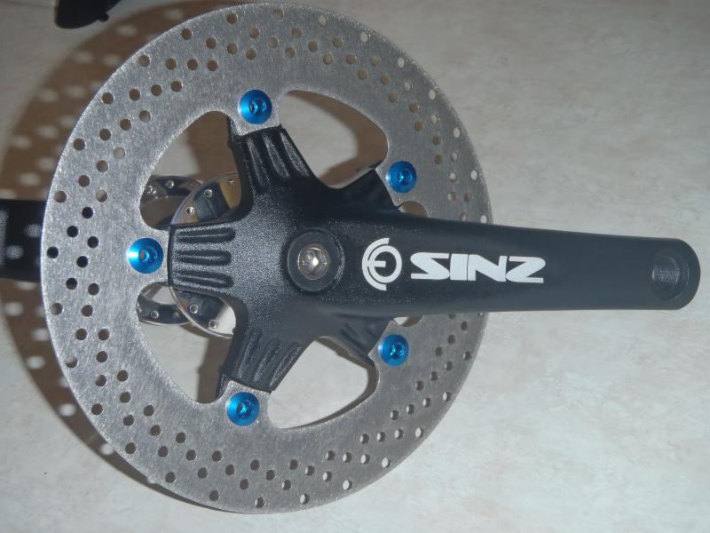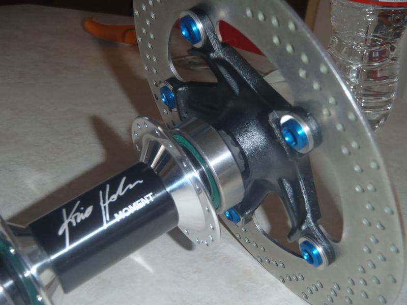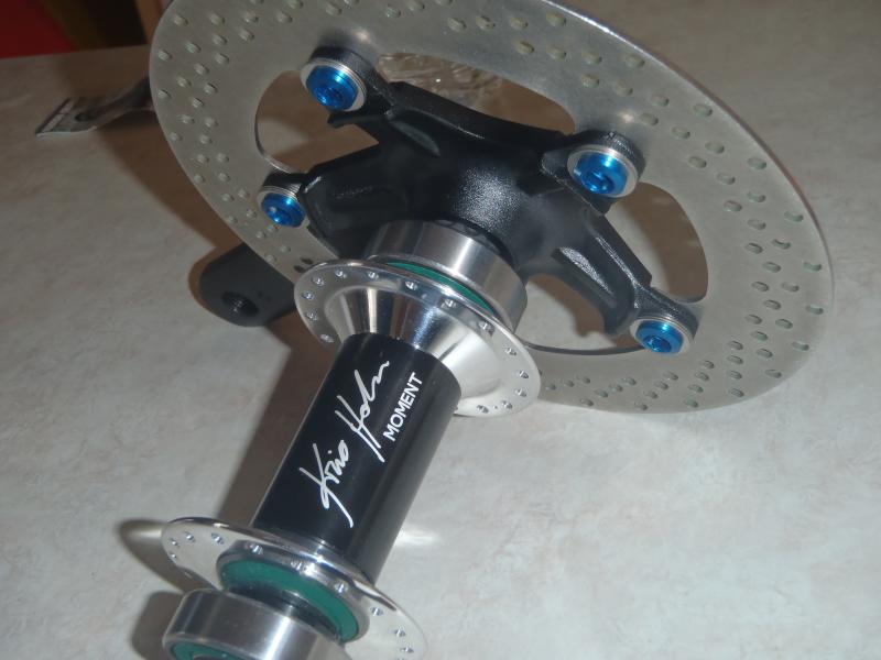 At long last, Here are some photos of the New Production Disc Rotor/Crank setups. We’re Completing some laser etching for the first batch, and they will be ready for shipping after the Thanksgiving Holiday. The KH ISIS hub is a beautiful mated compliment to the Set-up. Depending on steel or aluminum frame, we have steel mounts that will come with the package. For aluminum frames, we are finishing up work on our Lower Bearing Cap Mounts that will retrofit a disc caliper to all Nimbus and KH frames.