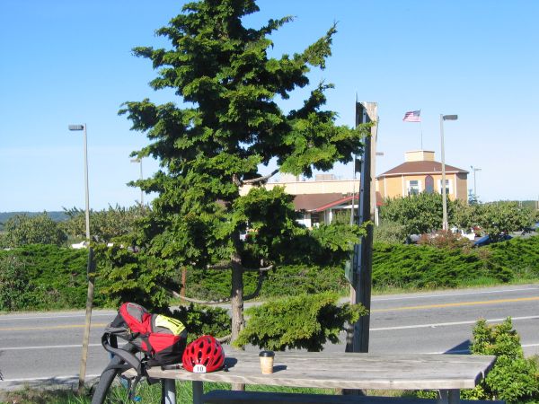 Now, after coming off some pretty major espresso distance training with john_childs, I knew my best chance of success would be to take a quick break and re-fuel with a double espresso. Take a look at the picture below, and specifically at the flag across the street. I didn’t have to wait for the right moment…it was just pinned horizontal like that. Just once, I made the mistake–in desperation–of thinking that a couple of cyclists would offer a bit of a wind break. I worked hard to catch up to one couple that was making slow progress, just to find there was nothing there for shelter. Ugh.
