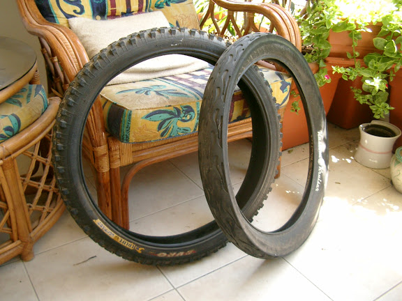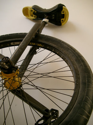 The muni is a 24" splined qu-ax with a yellow hub: super-strong. It comes with steel pinned pedals(Factory of Madness) and three tyres: Wildlife Duro, Hookworm(it’s on now) and a Fireball. All the tyres have been used for less than six months each and still have quite a bit of thread on them.