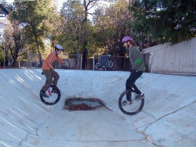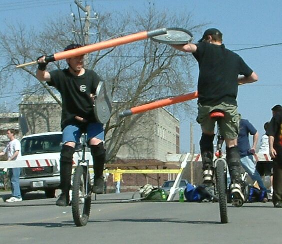 –Okay, here’s an idea. I just thought it up, so you won’t hurt my feelings if you don’t like it. Unicycle Twister. We have four (or five, or six) colored circles. The competitor starts in a circle, and a spinner is spun. Whatever color comes up, the rider has to jump into that circle and wait there until the spinner is spun again. Then they have to jump into that colored circle. You count the number of successful jumps they make. They are out as soon as they leave the circle that they are supposed to be in that round. If it’s too easy, maybe the circles get spread farther apart each time they are successful.