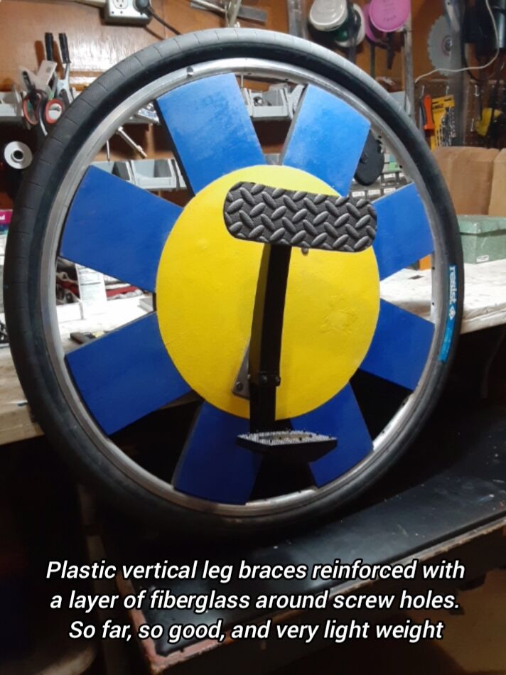 Haven’t tried this yet, but I think it may work with UWs. Standard pedals with vertical 1/8" aluminum flat, angled inward to resist leg pressure while pedaling. About the same vertical height as the Lunicycle leg braces. The other difference is that this setup has the pedal threads inline with the surface of the pedals, as opposed to the Lunicycle where the foot platforms are several inches below the pedal threads. We’ll see what happens.