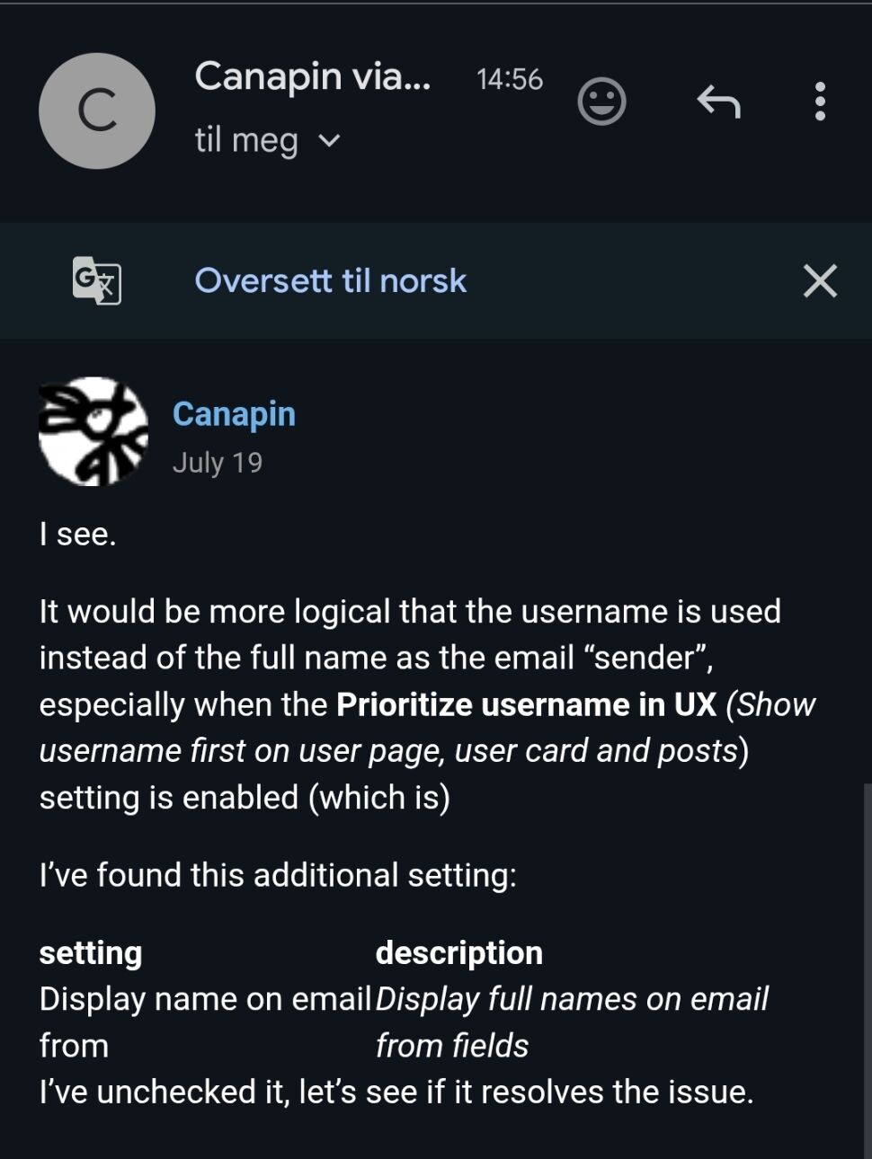 It would be more logical that the username is used instead of the full name as the email “sender”, especially when the Prioritize username in UX (Show username first on user page, user card and posts) setting is enabled (which is)