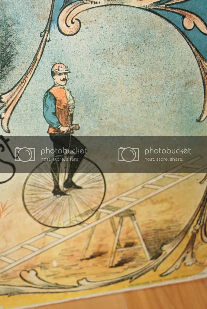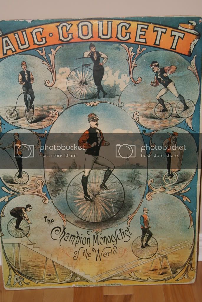 Does anybody have any information on this poster? Looks like it says AUC COUCETT. At the bottom in small it says: Afeiches Americaines. CH lEVY 10 Rue Martel Paris. On the back a sticker reads: Creation Exclusive Custom Made Expressly for RIEND RESTAURANT LTEE(end may be cut off) #4 AFFICHE “Champion monocycliste”. Then a logo with a unicorn that says ARTISTICA and in tiny print underneath it says Montreal.