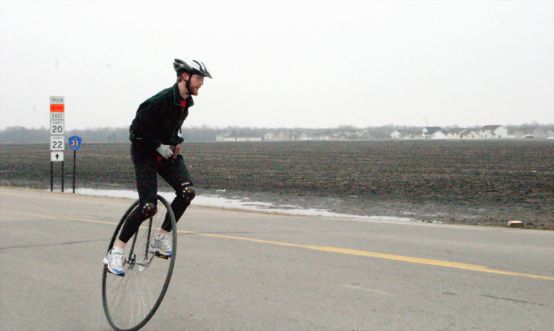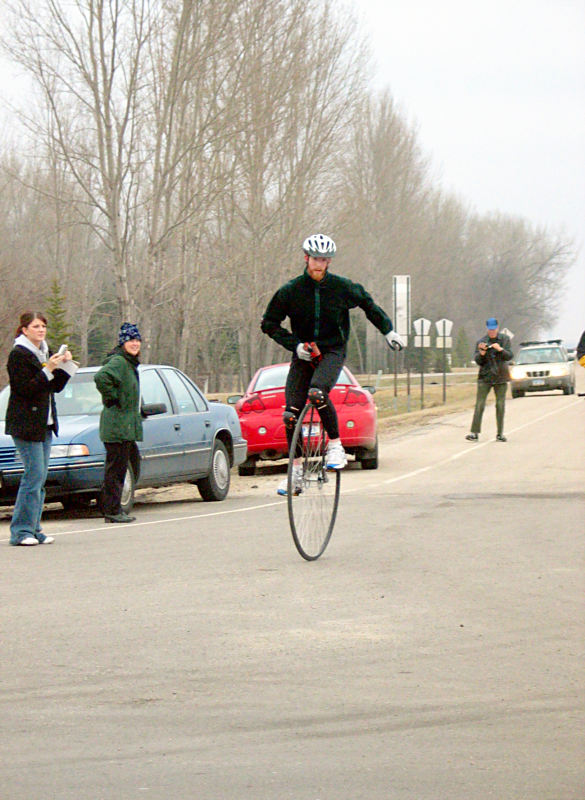 On the pictures you see Zach revving up on the long stretch, and (in the second post) at the turning point. The unicycle is a 45" custom machine, built by Sem Abrahams.