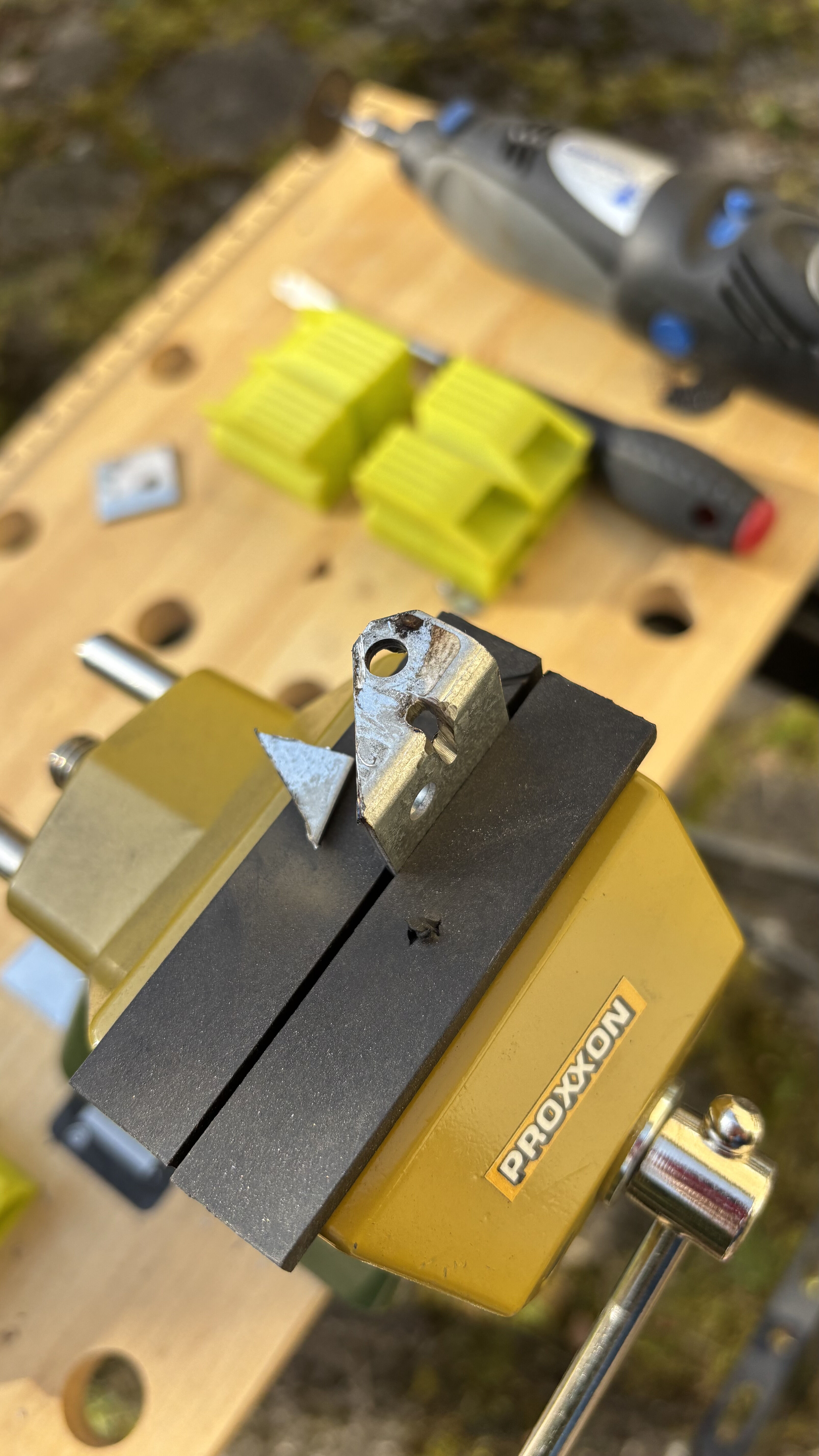 Just used a Dremel (multi-tool) as shown in the background to make a few cuts in the L-bracket and then used a bit of grease and some Loctite to put it all together. What exact spacer and washers you need will likely depend on the v-brake used. I just used some cheap/generic that I sourced from Aliexpress together with the other hardware.