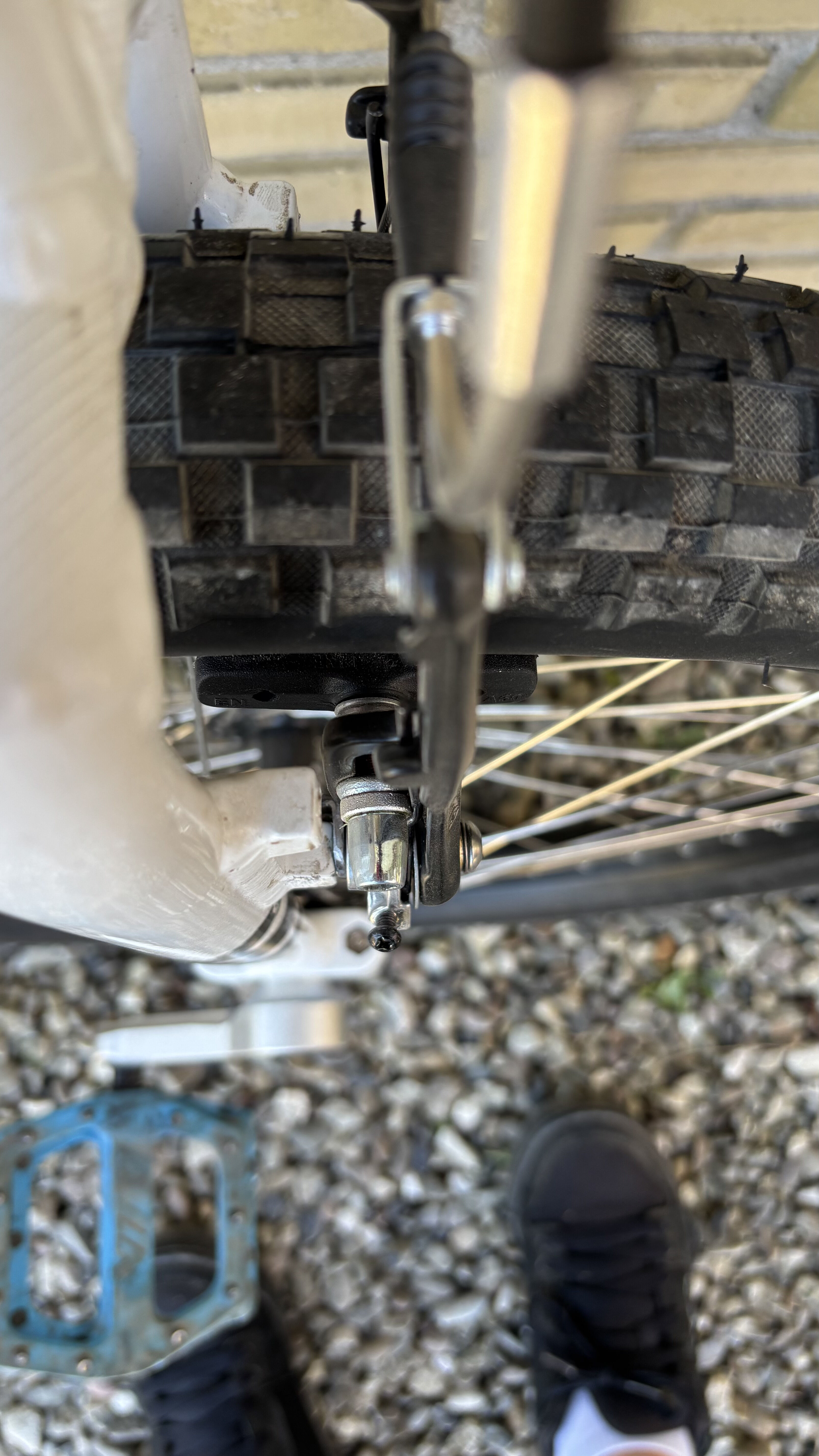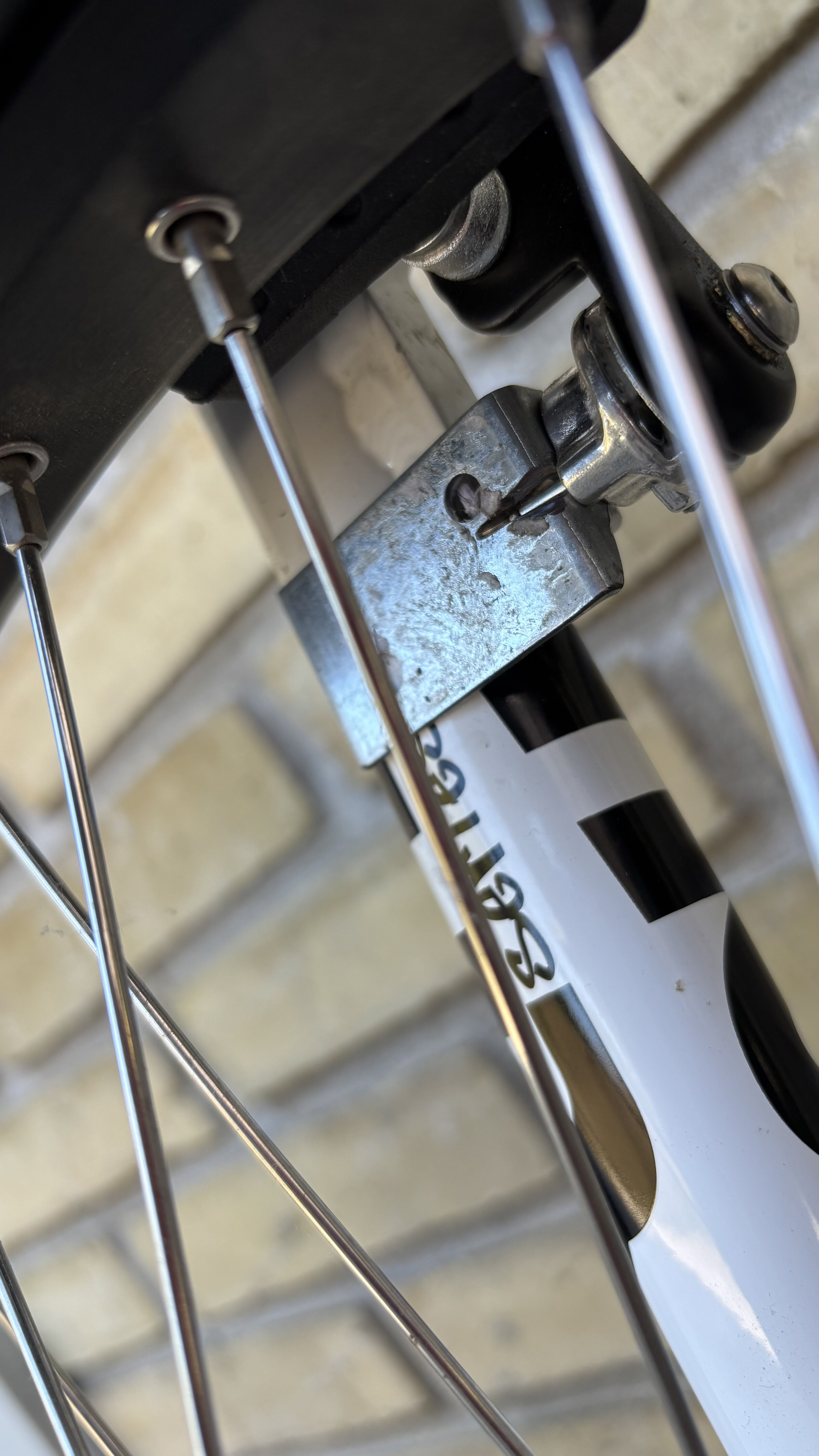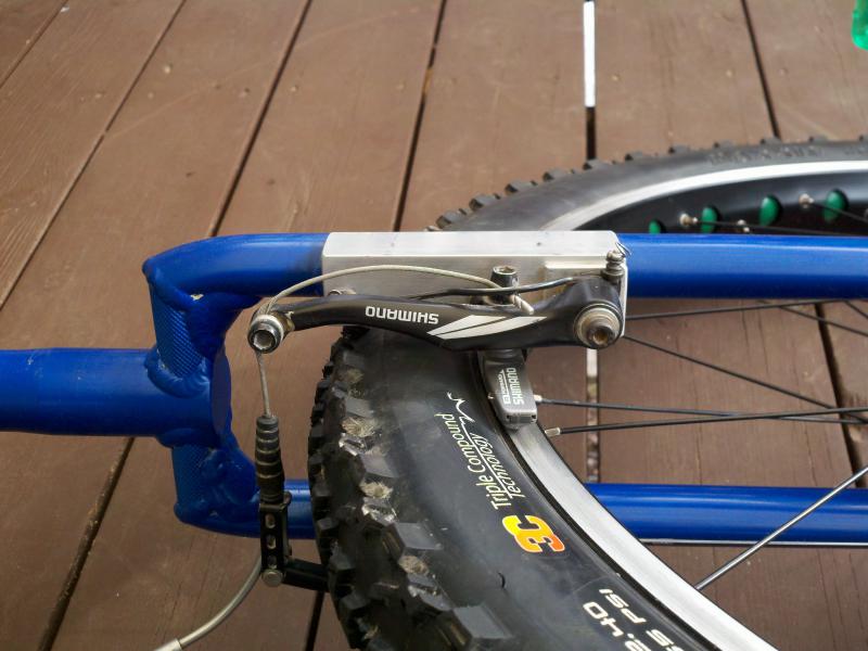This works just fine, although maybe not the prettiest thing in the world. Same setup as I used in my prior post, but I added an extension to move the location of the v-brake mount. I added a spacer so the brake would clear the little mounting screws.