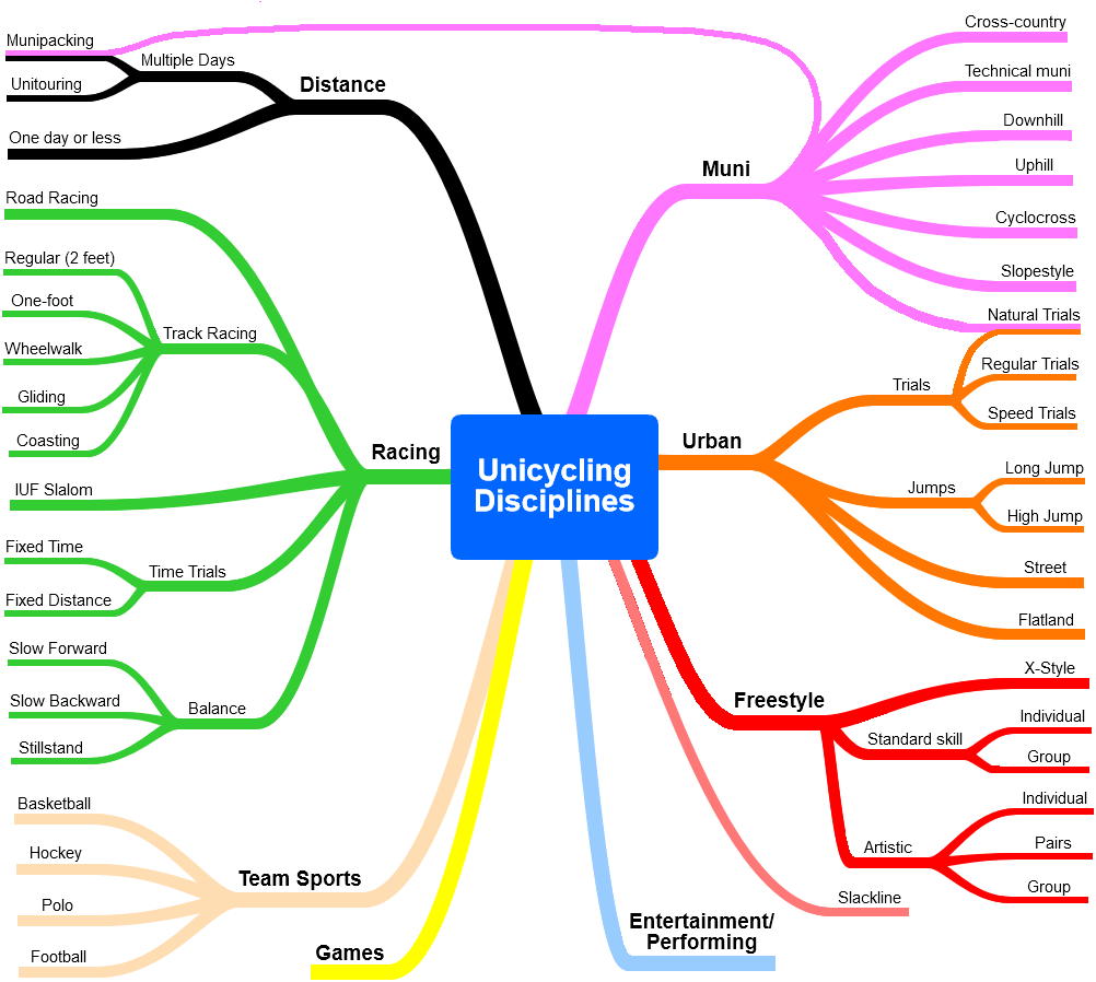 The diagram still doesn’t address equipment. I think that using a specific type of unicycle (large vs small wheel, fatter tyres etc) in itself is not a discipline. Specific disciplines have other equipment demands than others. Still, there is always a /range/ of equipment that can be used for any discipline. Notable, freewheel is mentioned nowhere. It seems that freewheel unicycles are gaining popularity. I think this will lead to freewheel unis not being ridden just for the sake of being freewheel, but to be used in various disciplines without fundamentally changing those disciplines. Similar to how unicycles with brakes, or with gears, can be used for various disciplines. Having said all that, I may work (later!) on a somewhat similar overview of unicycle types.