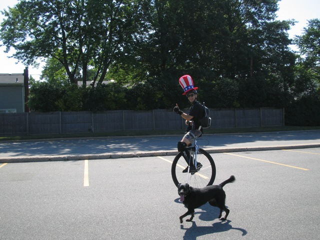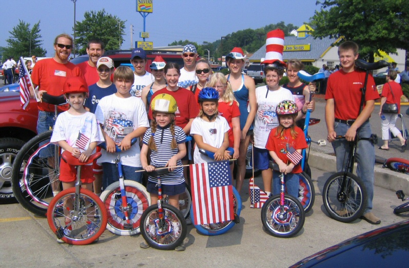Biggest hit of the day was having most of the riders fall off the unicycles and play dead everytime the Militia Men fired their rifles. They were marching directly behind us and were shooting over our heads. Got a big laugh every time.