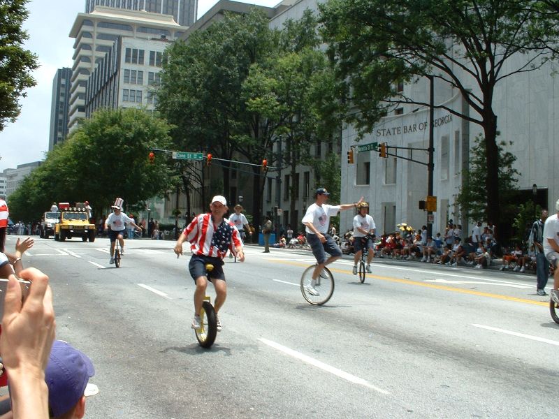 Followed by the Bugman’s white Atlanta Unicycle Club Jeep. The little girl on top of the Bugman’s white Jeep is my 7 year old daughter. She was tired after the first parade earlier in the day and had earned a rest.