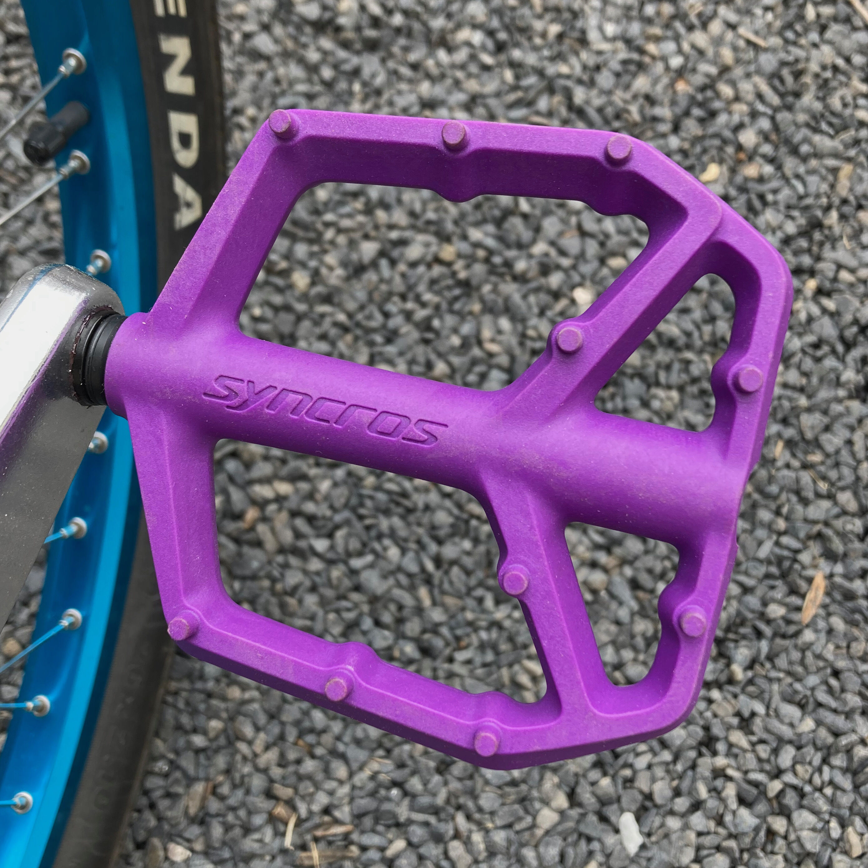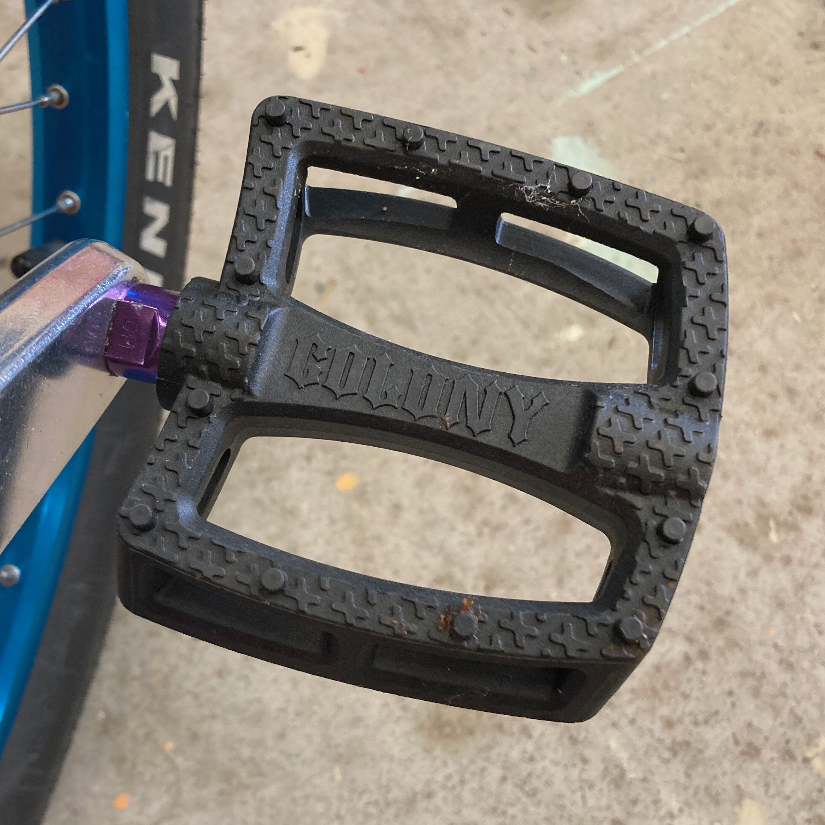 These are replacements for the Colony pedals on my 26er. Compared to the Colonies they’re larger, feel much tougher, have decent (plastic) pins, minimal axle bulge and are much more purple. Plastic pins, so still not super grippy in the wet, but I wanted “tame” pedals on this unicycle.
