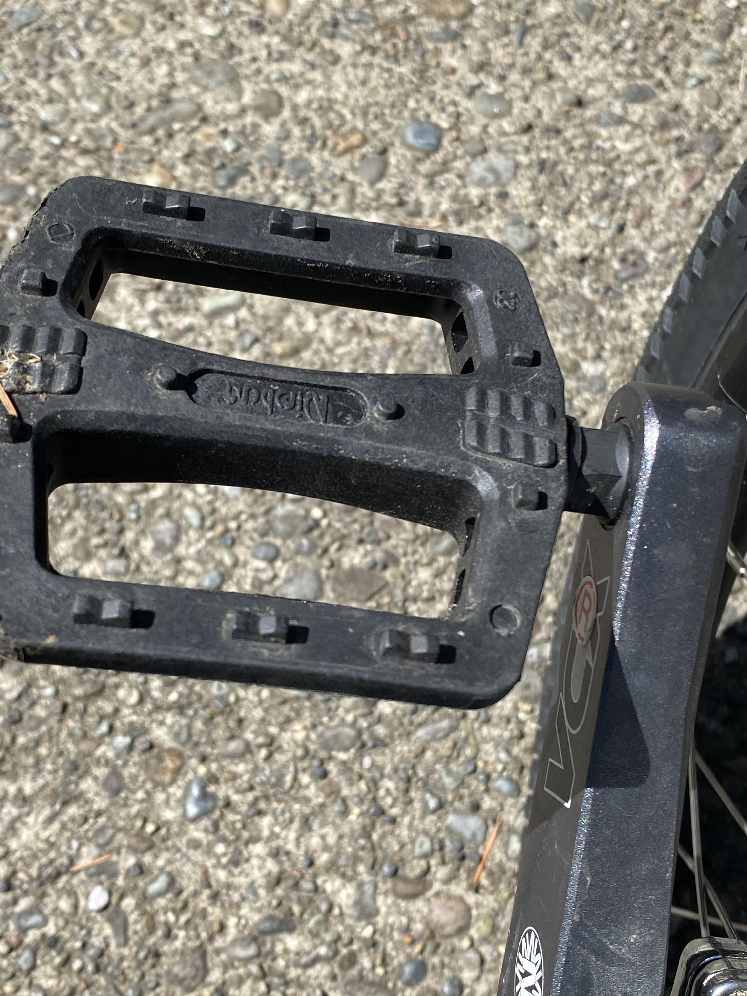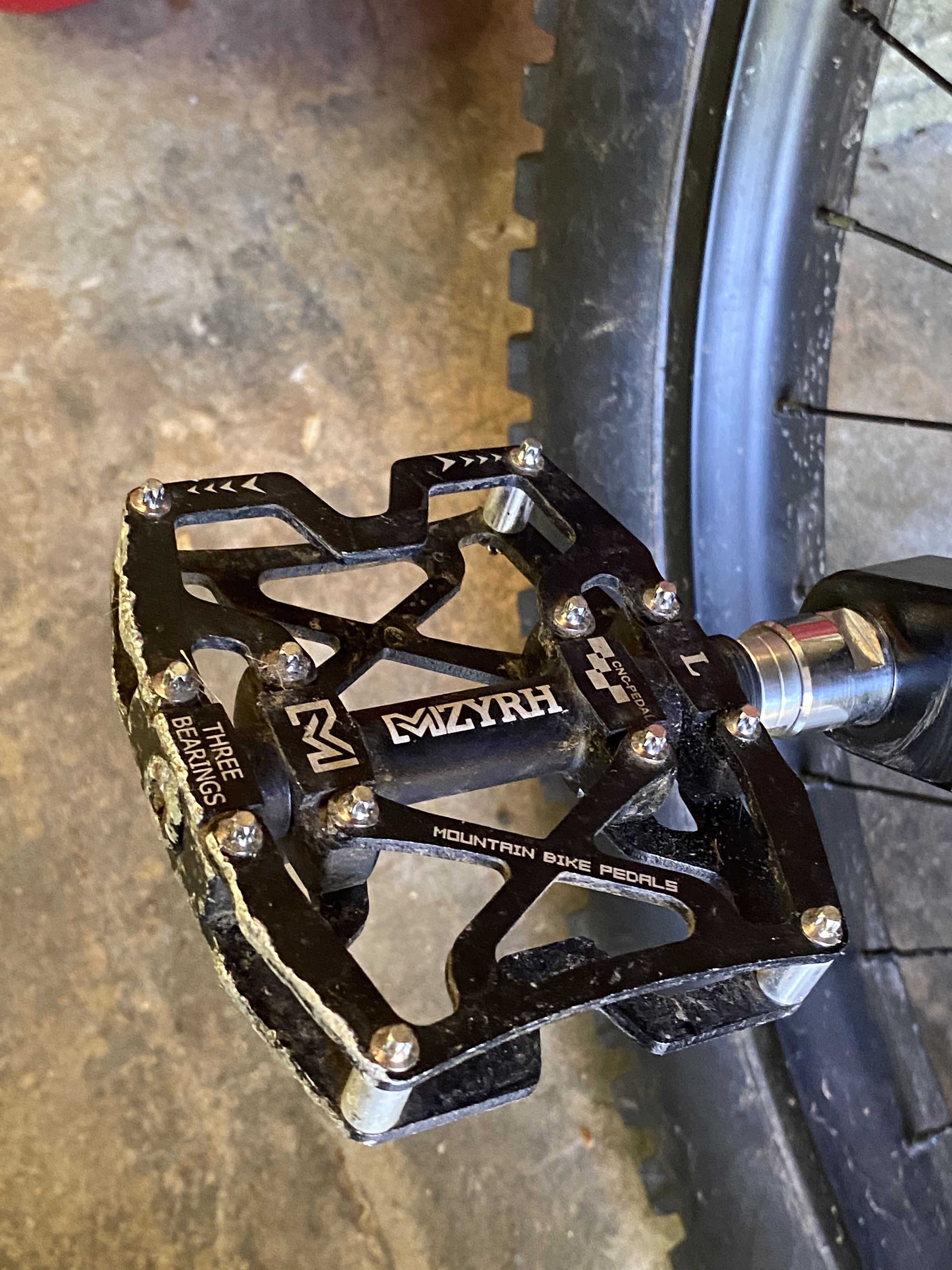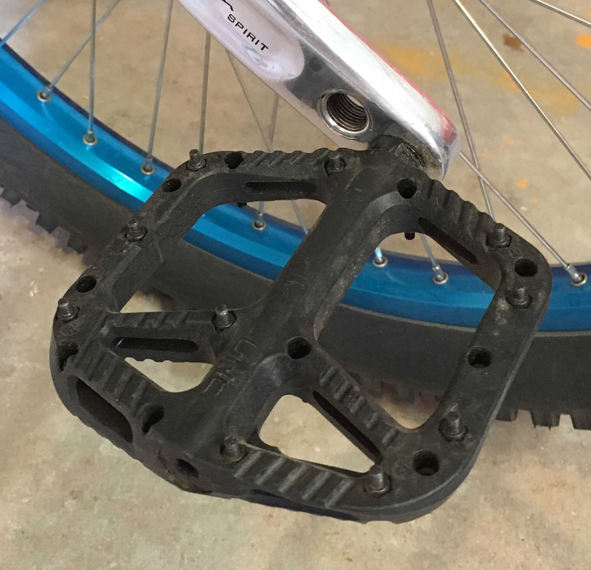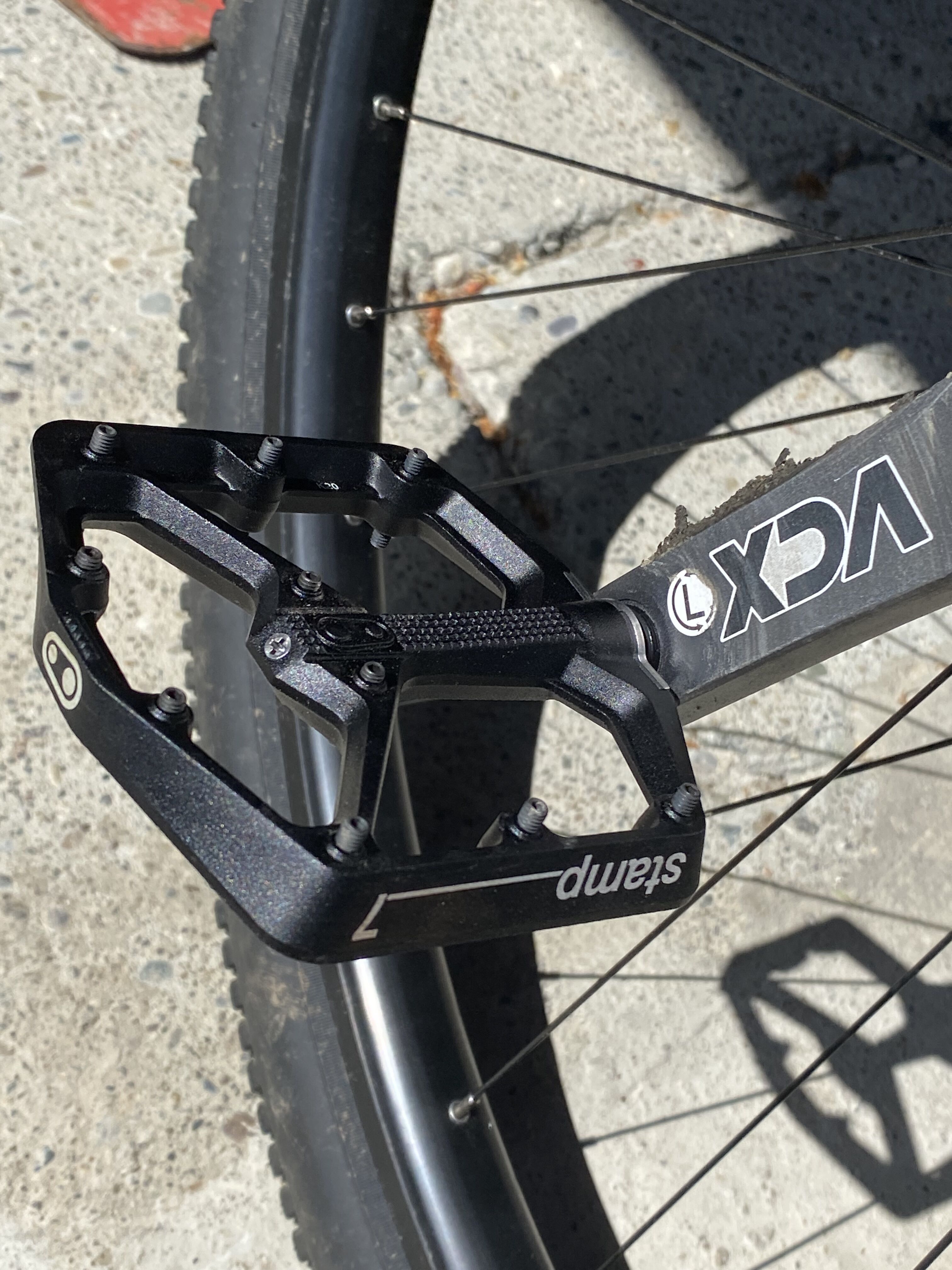 Nimbus with steel pins. I don’t really care too much for these. Like the Mzyrh they’re a little too narrow for my wide paddle feet. They also have good grip, but I find it harder to shift my feet on them while not feeling as well supported and locked in as with the Stamp7’s. I find that when I try and move my foot backward with these that the pedal frequently flips over and I end up riding on tip toes.