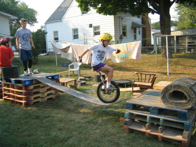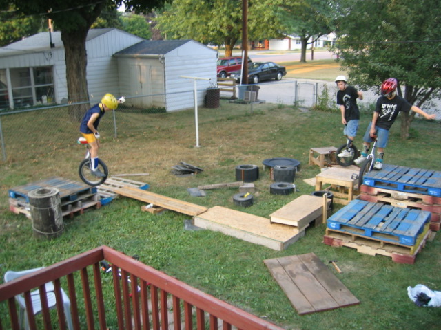 I built a slack bridge into the boys’ trials course this morning and got some pictures of Ben and Brad riding the bridge. It seems pretty easy to do but maybe so because of it’s short length, about 10’. The real problem was trying to keep the pallets from tipping and moving, something we’ll have to address when we have a few more minutes than we have tonight.