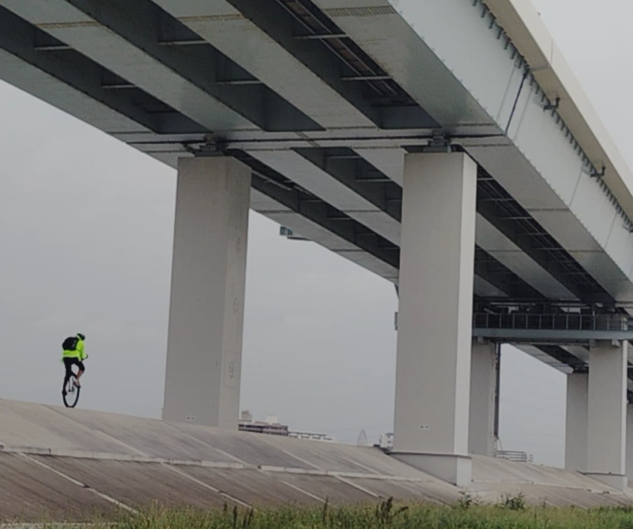 Riding on narrow strip of land between Nakagawa River on the left and Arakawa River on the right. Under the Metropolitan Expressway approaching Kiyosuna Ohashi-Dori Bridge, Tokyo Bay.