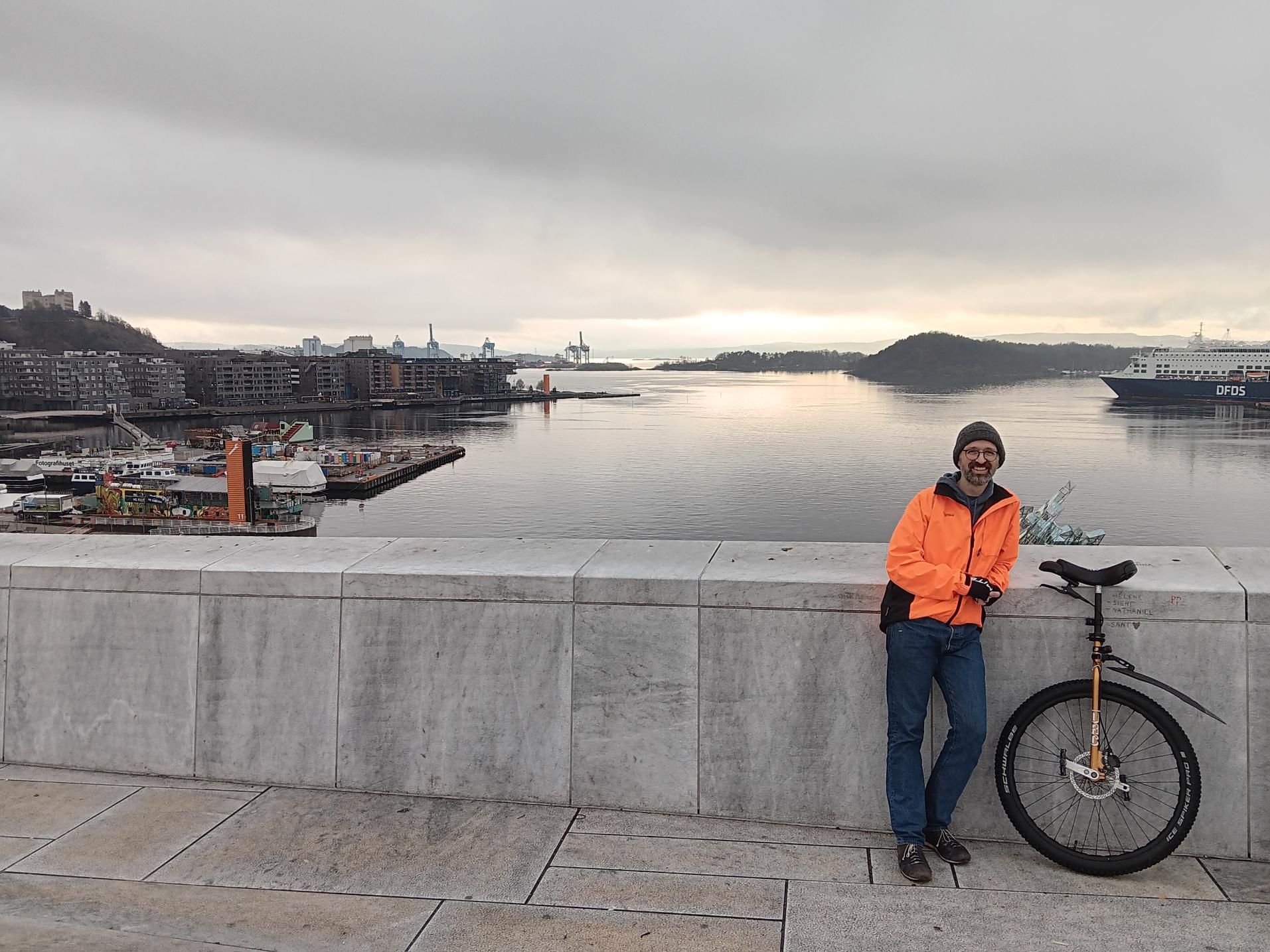 At the top of the Oslo Opera house. You are not allowed cycle up here but I do it all the time.