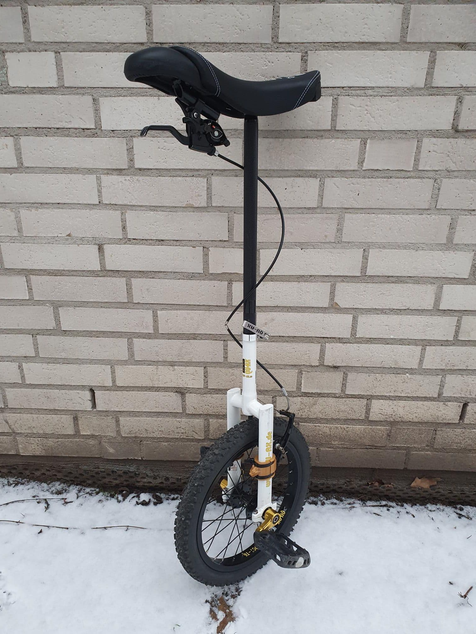 This is a 16 inch unicycle with a a brake, using a 3D printed brake mount, a self studded tyre and 45mm cranks.