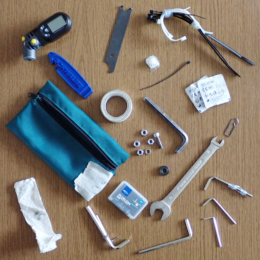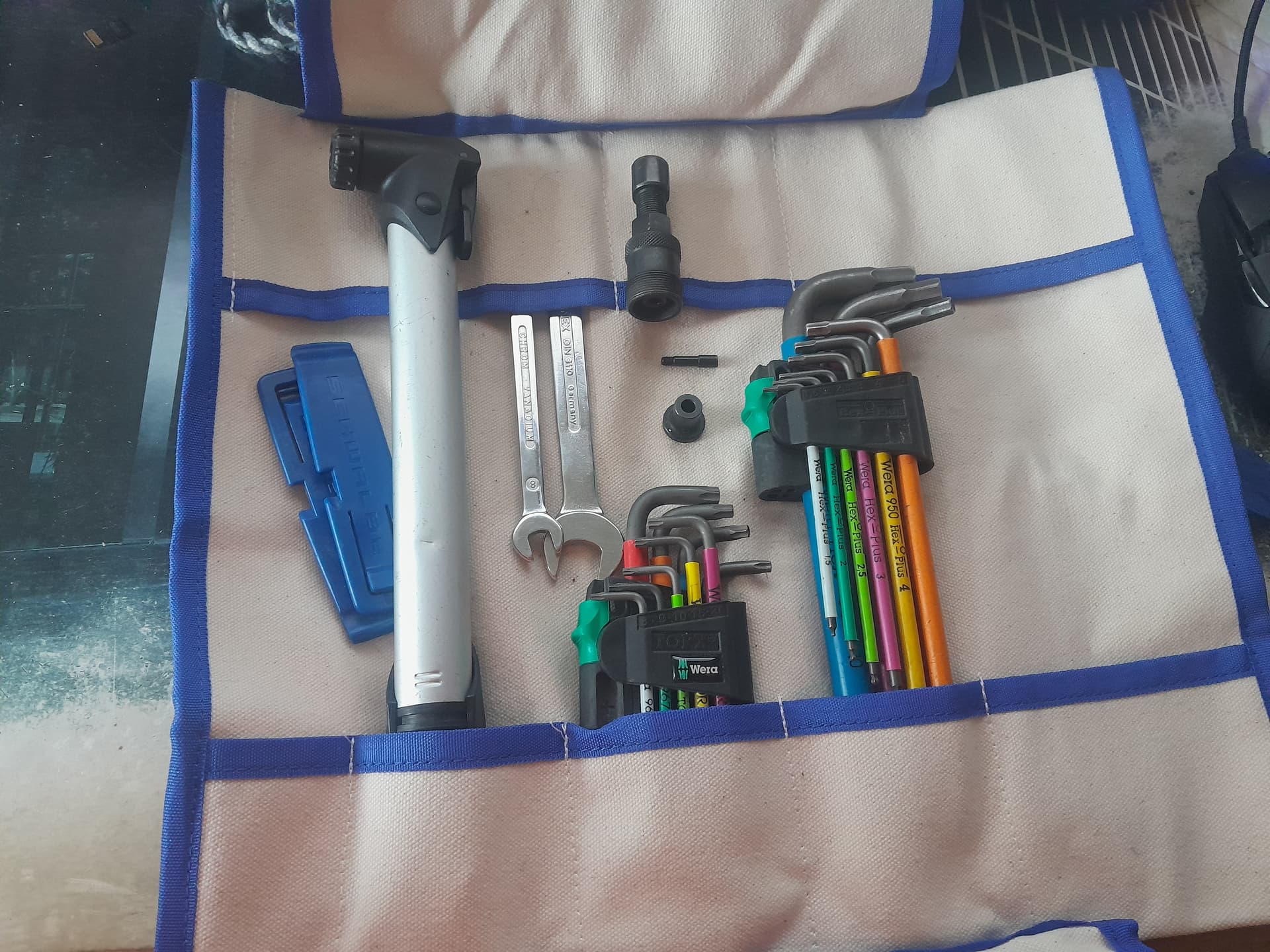 When I’m on longer trips, I usually take the “basic” tool kit with me. Ideally, a 2. 8 mm open-end wrench and a patch for the inner tube would be ideal. The whole thing weighs about 1 KG. As an additional option, I carry a tube.