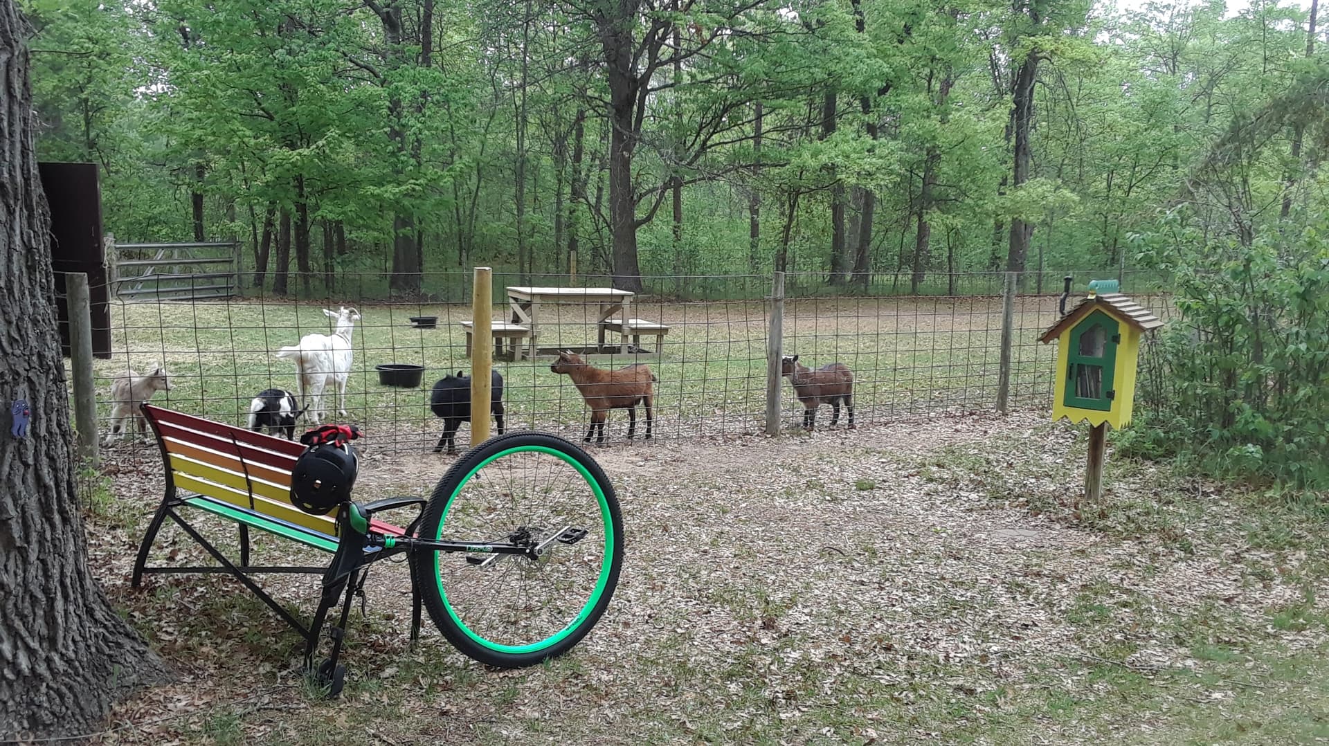 It’s on a small section of the southern end of the Paul Bunyan Trail here in Minnesota. I’d reckon the "fairy trail"section is about a mile and a half long and its decorated with small figurines (one can be seen to the very left of the photo on the tree). The goats are kept in an enclosure right next to the trail. ![]()