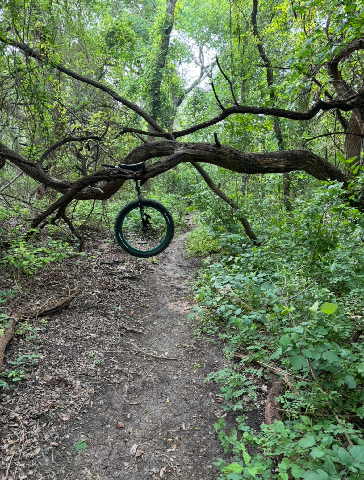 We had a full week of rain (flash flooding, downed trees) that kept me off the uni, so when Saturday was “definitely no rain absolutely dry” I was out like a shot. And of course what happens as soon as I start riding? Somehow “0% probability of rain” turned in to “100% chance of rain following you wherever you ride”.