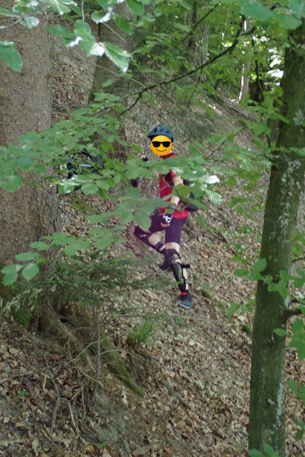 Some days ago I texted two people to see if they had time for a muni ride today. Three of two had time :-), so we were a total of four unicyclists. Nettles and thorns forced us to take a different route than planned. After more (but manageable amounts of) nettles and thorns we treated ourselves with a ride of the Bärenried trail near Berne. That was pretty cool. It’s a very flowy trail for peeps on two wheels. With a uni a little less flowy, of course, but I rode about as fast as I could and enjoyed some of the banked curves (switched my 150mm cranks for 145s precisely to be able to ride the trail as fast as possible, and it payed off