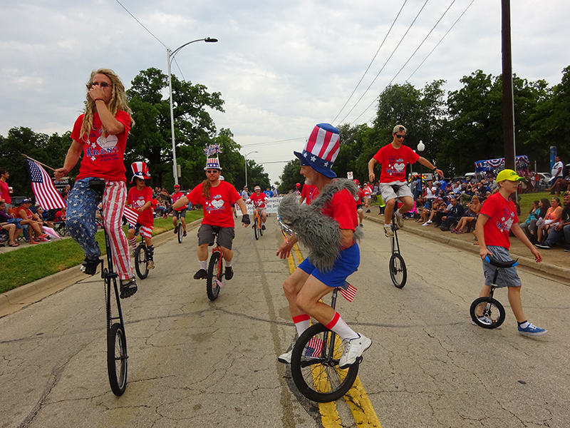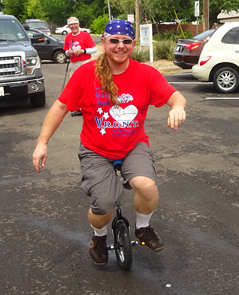 This was my first parade on a unicycle, the July 4th parade in Arlington, TX yesterday. The route was only 3 miles, but all the riding in circles and doing other tricks really wore me out, but it was worth it. Thankfully, it was raining all morning and the weather was fairly cool, and that helped a lot. Definitely going back next year, but I think I’ll ride a giraffe instead. Those guys definitely stole the show!