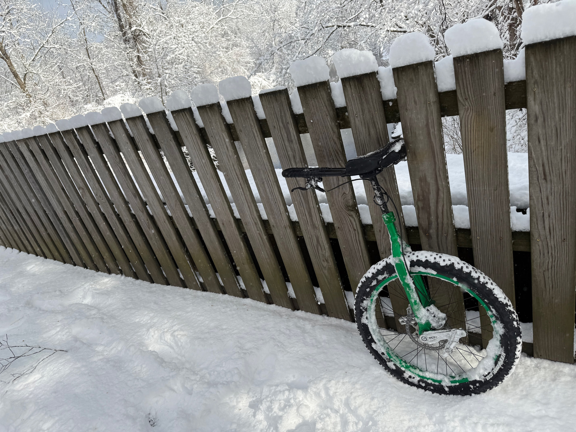 Last weekend’s ride: about 5” (12.5cm) of snow! Unfortunately the tire wasn’t up to it. I’m going to have to get a proper studded tire, aren’t I? Sigh. In January my 29er (Teravail Coronado) was fine (in much less snow), but the g24 (Vee Crown Gem) couldn’t hold enough traction in these conditions.