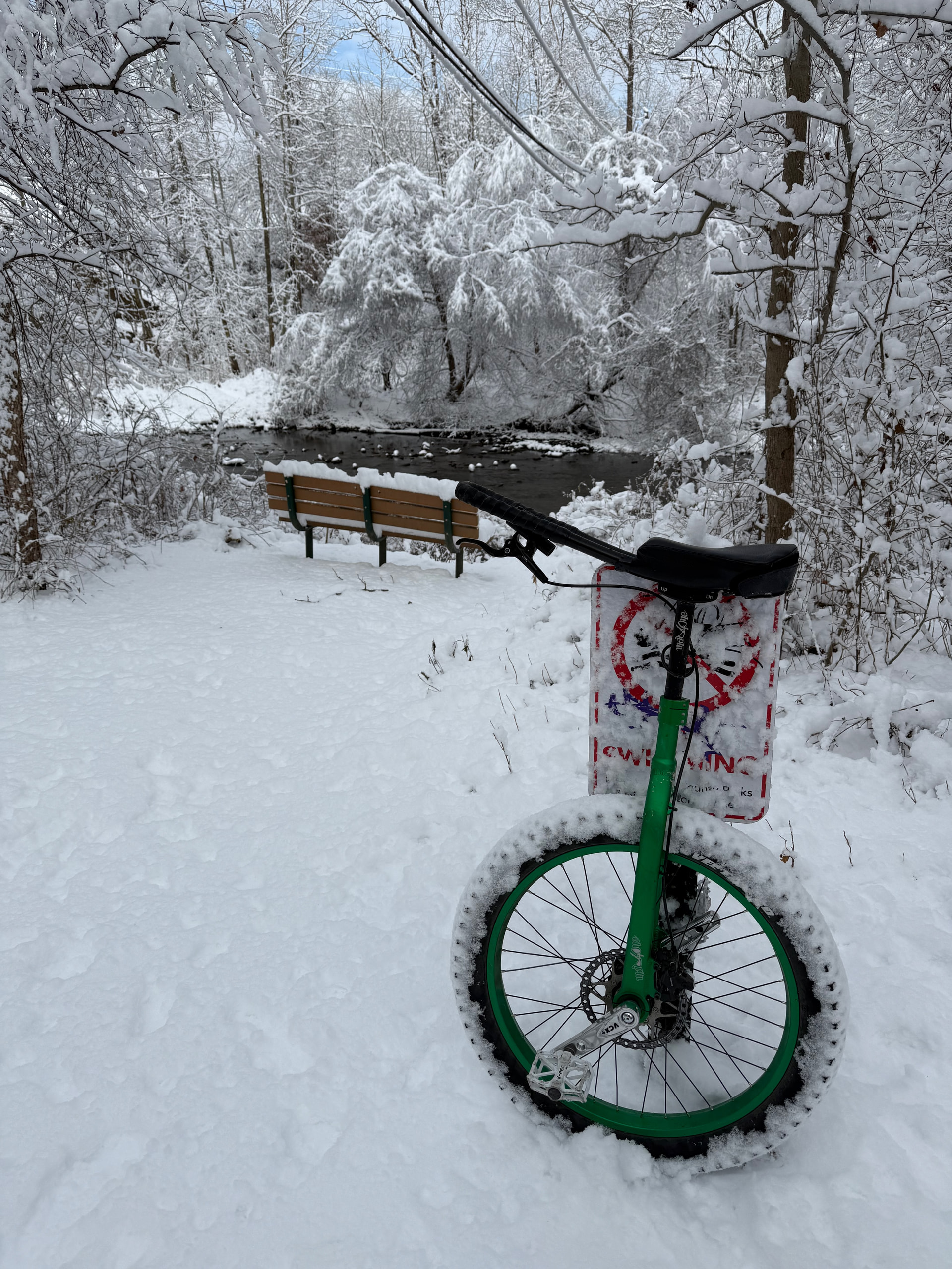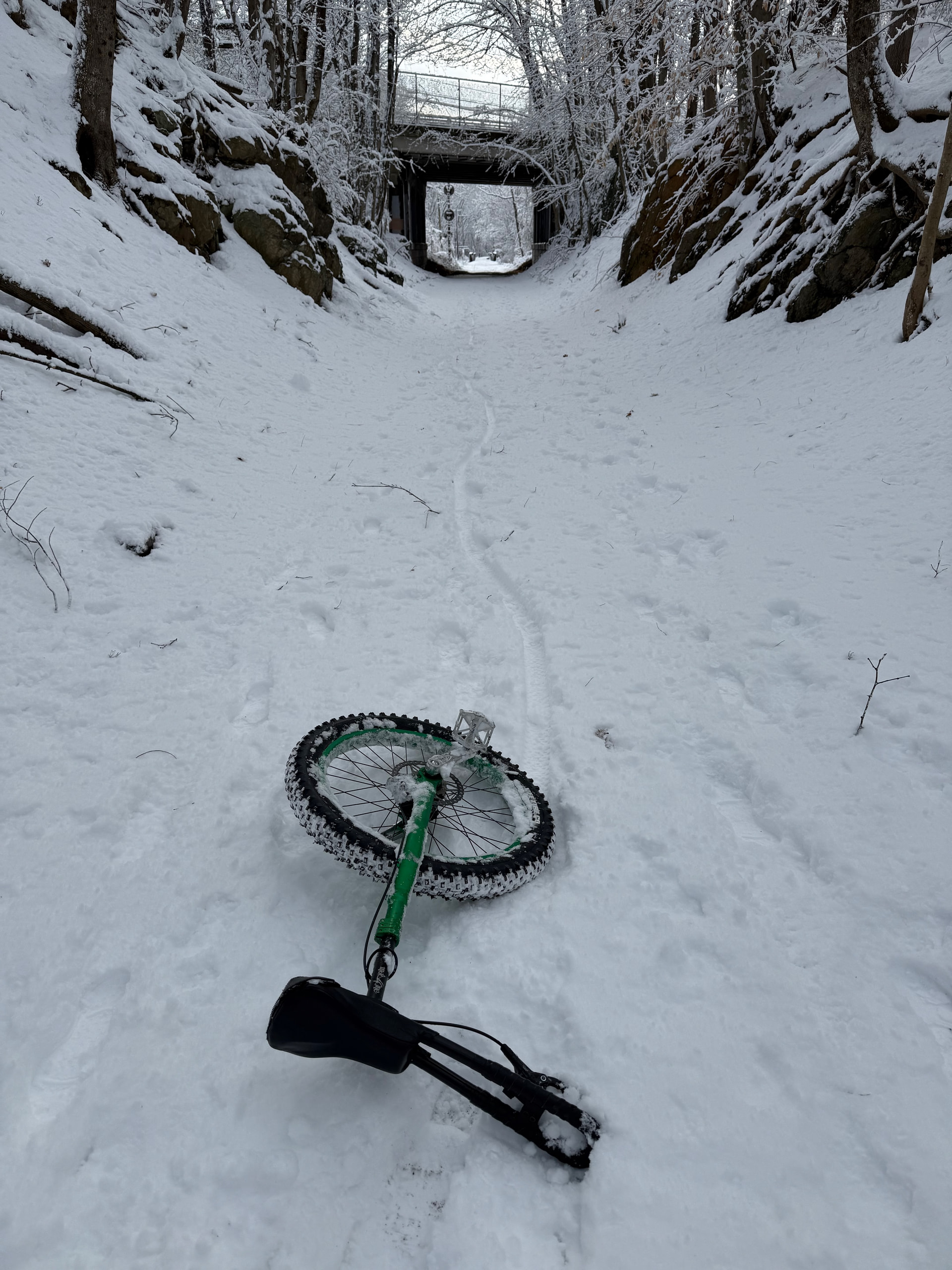 Half a mile in a half hour, which was a lot of mount - two revolutions - UPD. A few longer stretches; mounting under the bridge let me get a good start that lasted a few hundred yards a couple of times. But a lot of good practice on centering my balance while freemounting. I apparently lean back too far and compensate easily when there’s enough traction… had to adjust that to really center myself in the snow!