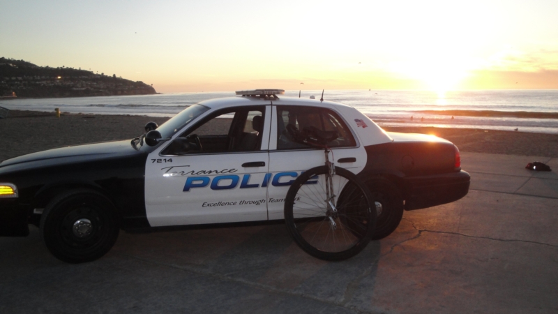 Here are some pics from my second rode of the day…as if hardcore Hummingbird wasn’t enough! Another gorgeous late afternoon at the beach for a coker ride. I can’t believe the cop let me take a shot with my 36er leaning against his cruiser, haha!