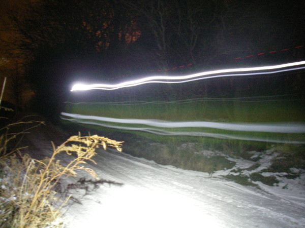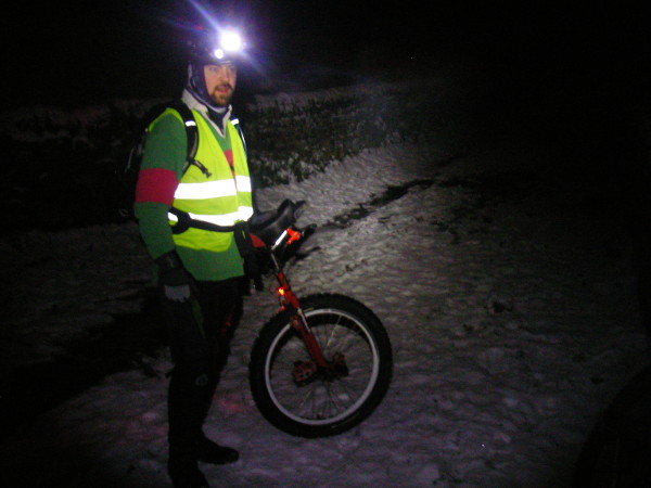 Spencer and I celebrated the winter solstice by going on a night ride. A quick spin of about 10 miles, over hard frozen snow. I don’t think I’ve fallen off so much on a ride for a long time. If it wasn’t the sliding on things, it was hitting a frozen rut at the wrong angle. I also got quite wet legs trying to ride a ford, as I discovered that the 2 foot of snow on the edge of the stream was actually sheet ice, and got dumped into the stream. Brrrr. What a good ride.