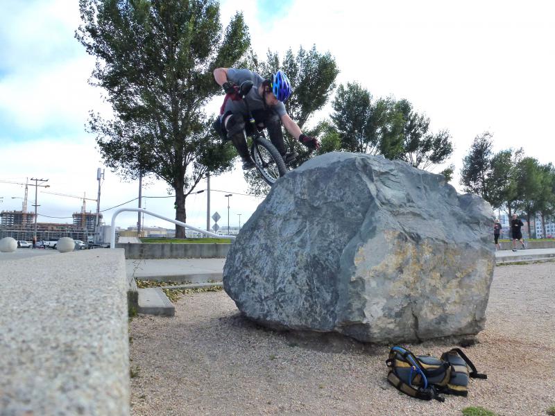 Met a guy in the city today for some trials there. It was lots of fun and he gave me so many great tips about bouncing and prehops and stuff. I learned a lot and made real good progress. Best thing was when I got my tire up about 65cm (didn’t land it, though, as I fell backwards all the time).