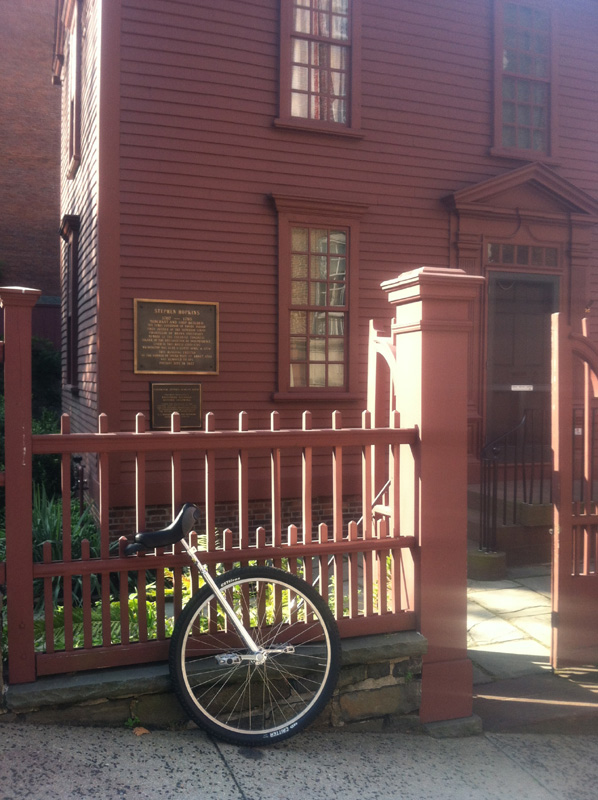 This past weekend my wife and I took a short vacation to Providence, Rhode Island. I had the pleasure of briefly riding around the historic district going past the Roger Williams National Park (appropriately, since it is in Rhode Island, the nation’s smallest national park) and then up to Benefit Street originally settled by Roger Williams and his crew (for the benefit of all). The picture below is The Beast in front of the Stephen Hopkins house built in 1743 (though not apparently in its original location). The Rhode Island School of Design is on Benefit St and Brown University is a bit up the hill from it.