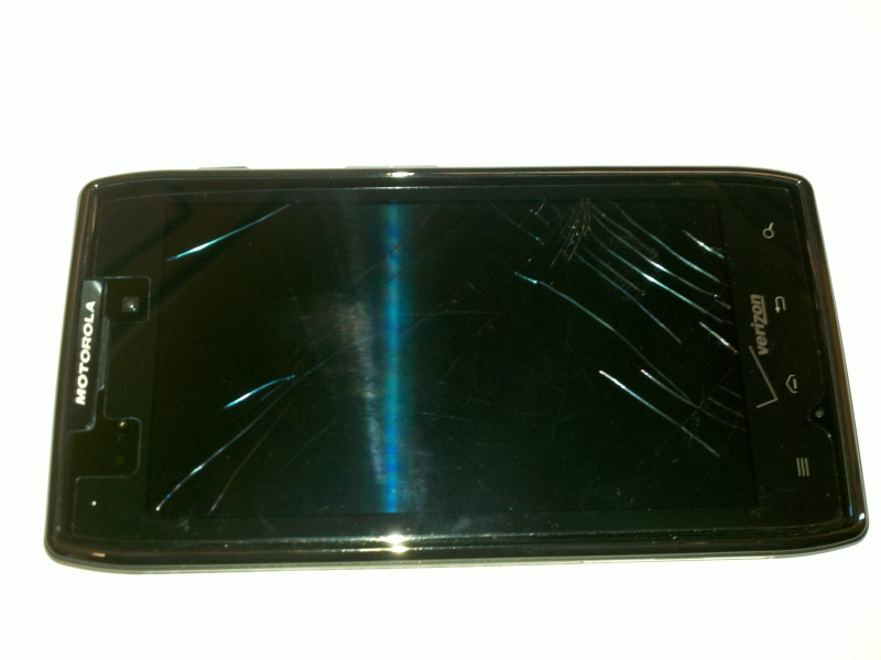 My old Droid Ares looked just like that; like it took a bullet to protect me! I was riding along at a nice clip in high gear on a rough 4x4 road when next thing I knew I was flying through the air with the greatest of ease. Went into a dive roll and I emerged unharmed. Unfortunately my phone took the brunt of the fall in my pack. But the damage was cosmetic only and still worked quite fine for almost another year before I finally replaced it (once my contract was up).