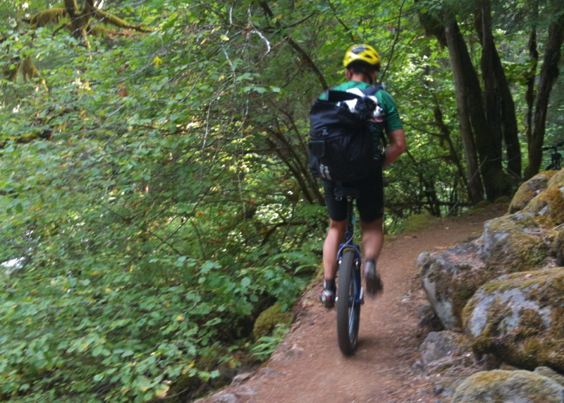 Lanaboos and I had a great ride on the McKenzie River Trail in Oregon. Sylvia the trail dog gave out on us. She is a little spoiled and seemed to be enjoying the backpack ride more than the trail run. We think she was snickering by the end of the ride. We did not have a shuttle service so ended up riding back up the highway to get the car.