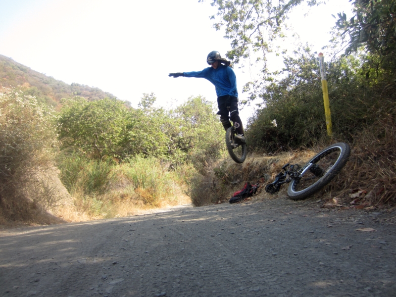 Met up with old Uni forum member “Skrobo”, (Steven) visiting from Texas. We rode MUni at Sullivan canyon this morning and had a great time! Steven is one of the best long jumpers there is! He went for an 8 foot rolling gap, but there was literally no landing area! He was riding my kh 24 and is more used to a trials uni.
