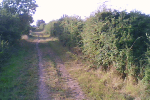 This leads to a narrow track. Oddly there are two tracks, as you can see, but the right hand one is better for cycling, despite having to force my way past thorn bushes. And there is a UPD making gap between the two so I cannot easily switch.