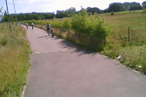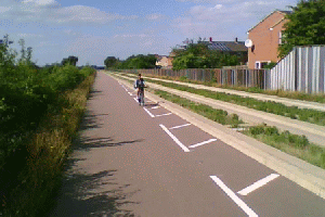 I reached the guided bus-way. Not the most interesting of routes. The sunlight shining on the tracks burns lines into your retina. After a short while I became aware of someone behind me, keeping pace. Presently he drew level, and we chatted. He was impressed at how easy I seemed to make it look. [Head swells] And he asked some sensible questions about learning etc..