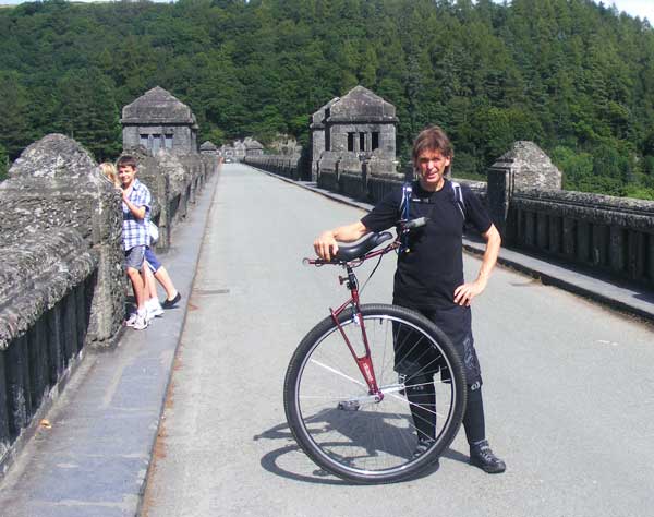 One of my favourite circular road routes takes in the Llanwddyn Dam. Quotations invited for what the little boy on the left might be saying about me/unicycle.