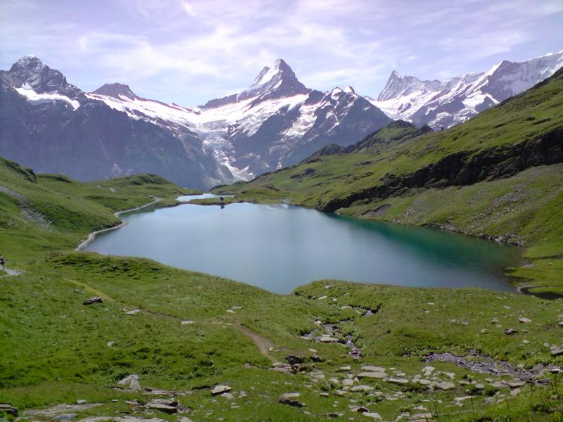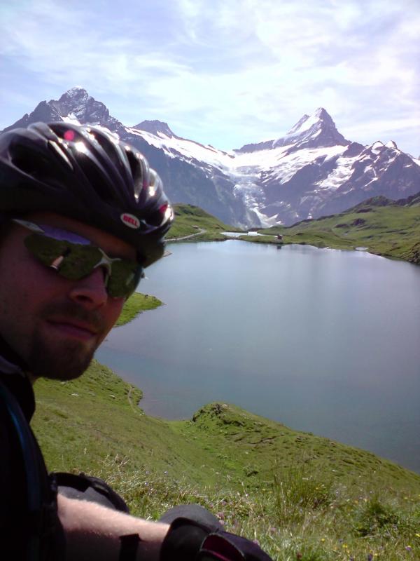 I started in Grindelwald from Hotel Wetterhorn/Oberer Gletscher (1’257m) very early in the morning (6:30h), rode all the way up the paved road to the Große Scheidegg (1’962m), then mostly on single track over to First (2’167m). There I took a longer break while increasing numbers of tourists kept poring out of the cable car… Then I rode over to the gorgeous Bachalpsee (2’265m), the big lake in two of the pictures. Lots of hiking tourists all over the place by that time, but still it was beautiful. From Bachalpsee I went up to the Faulhorn (2’681m), mostly by foot since riding was getting too exausting on the unpaved, steepish way up. Even walking was kind of tough because of the thin air and the steepness… But the view from the top was absolutely gorgeous! Such a great panorama! And almost no clouds at all.