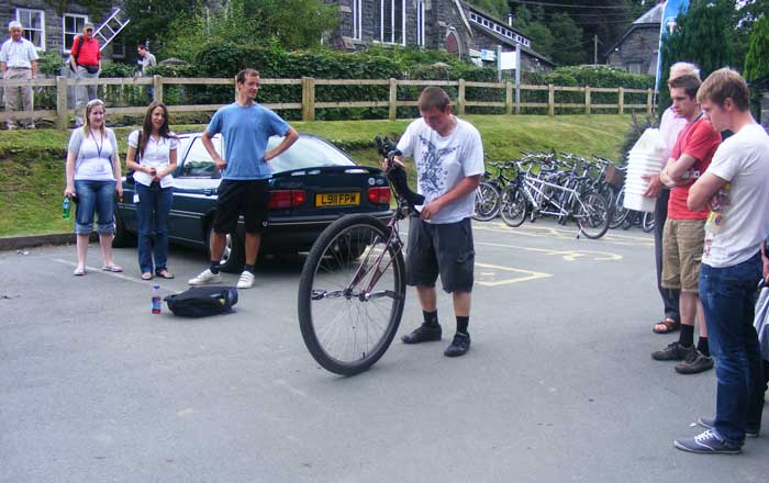 The photo shows how much attention the unicyle gets as people gathered around to watch the dude try and mount it. Off camera there were many more people - the whole place came to a standstill just to watch.