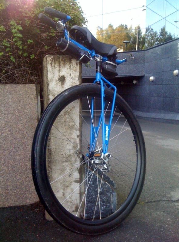 Did a test ride to work yesterday. New saddle (KH09), new cycling pants and a new drinking bottle. Unfortunately the shape didn’t work very well in the bottle cage, that is why it is in backwards*. The bungee cord is necessary even with regular bottles to keep them from wiggling loose during riding. Maybe I should have spent more than $3 on the bottle cages ![]()