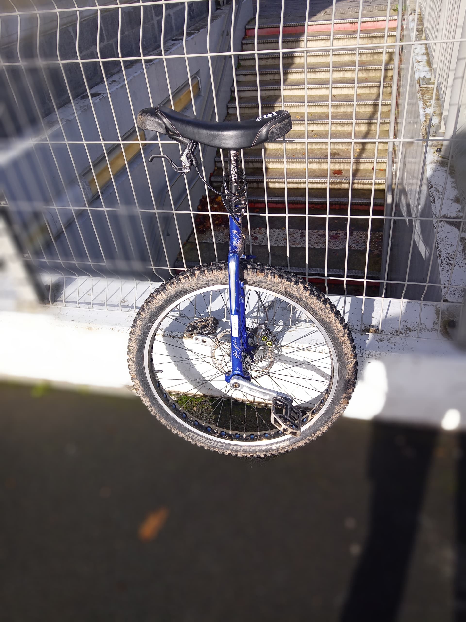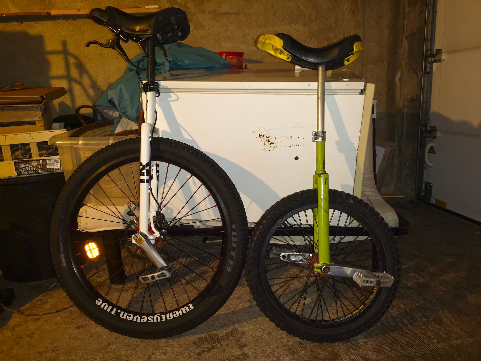 My current one, a 27.5" QX Q-axle, with the newcomer: a rusty, heavy 20" QU-AX generously donated by a friend, which will be used by people around me to learn how to ride a unicycle ![]()