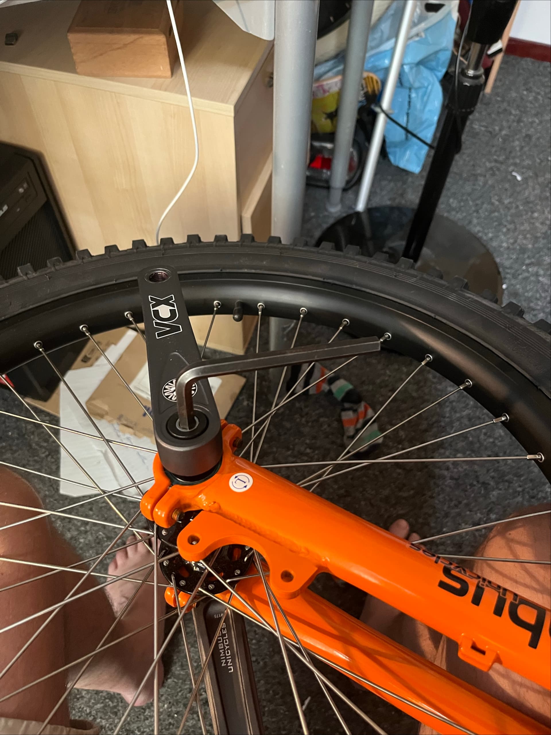 I wonât saw in the fork nor in my fingers. First I will use shorter cranks. I saw that the other 24 I have is a QuAx with a very different crank setup. I canât use an Allen key to take the crank bolt off. That uni has 125mm cranks, but I can understand muniâs have slightly longer cranks than road unis (runiâs?)