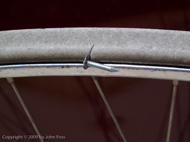 Hereâs my 45er, sporting a nail in the tire after the Carmichael July 4 parade. Having a solid rubber tire has its upside!