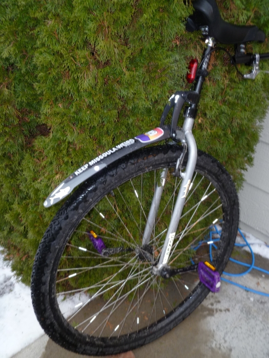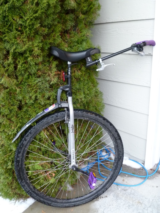 Updates: added a fender, swapped the KH “T” for a longer Nimbus Shadow “T” in the KH T-bar base, added another headlight (the Nimbus bar is enough wider to allow this), added reflectors to my pedals, and added a bunch of stickers, including reflective ones on the fender and on the spokes. The fender and reflectors support my efforts to commute more via uni. Got the reflective sharks from an eBay vendor called “Fun Reflectors”.