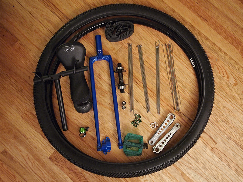 The photo was taken after I took apart the Coker wheel to swap the hub. I laced the wheel last night and will spend some more time tensioning and truing (and tensioning and truing…) before putting it all together.